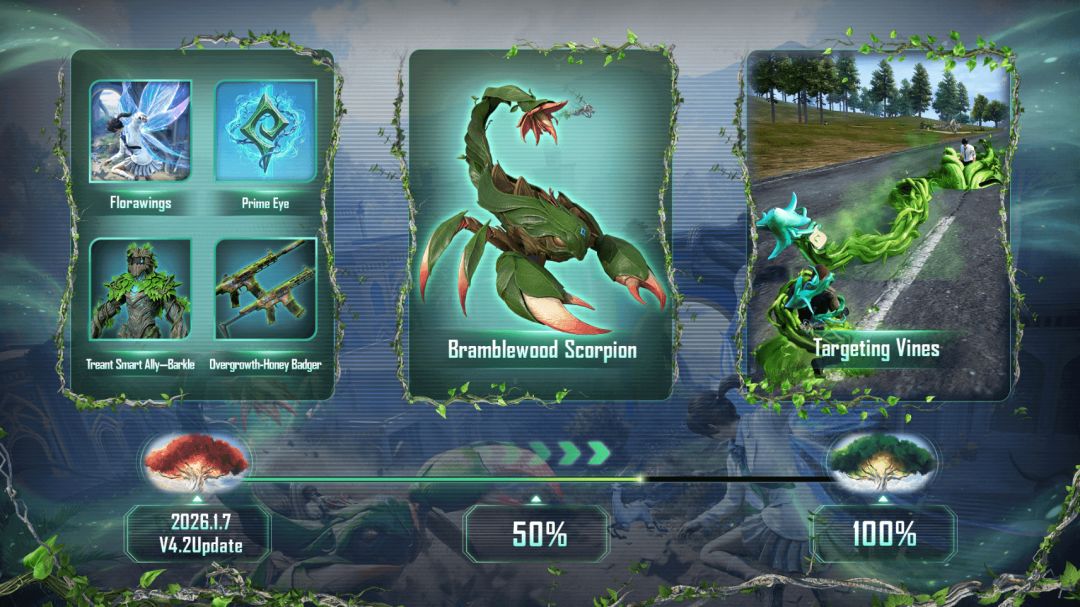 ● 全新「原初树境」主题玩法登场:今次的版本围绕世界树主题重塑Erangel,改造五大城区,在保留熟悉节奏的同时,带来更强的探索感与对抗变化。 神树之力降临,在全新建筑物与感染植物交织的战场中,邀请你探索与净化,体验更具沉浸感的生态对抗。