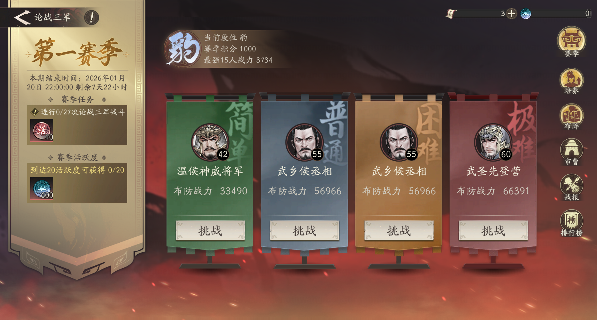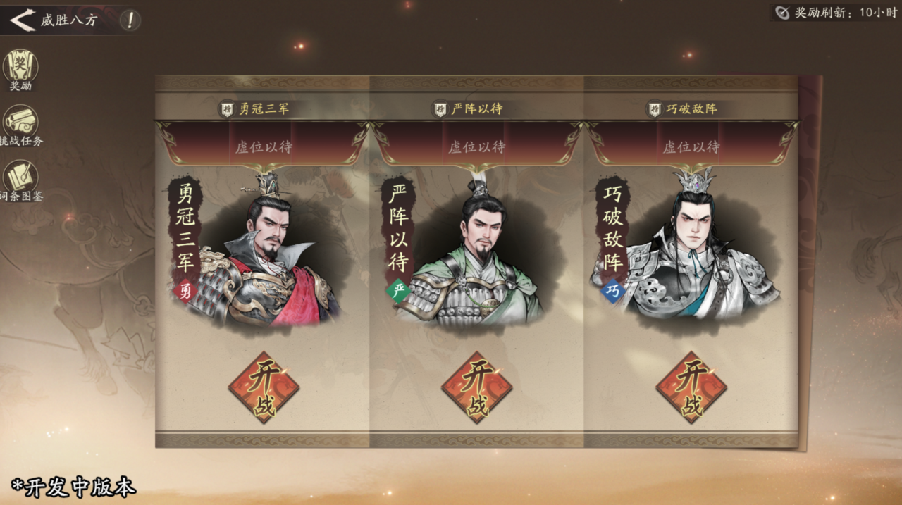3、新增周常玩法“威胜八方”,挑战曹操、刘备、吕布三位作战风格迥异的统帅及其手下将领,根据选择词条的总数获取更高的积分,可获得大量副将修行所需的修行精要;