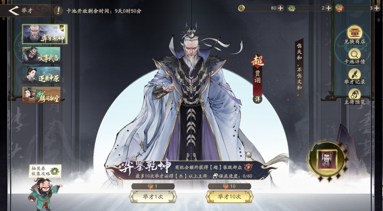 1、新增限定卡池“弈鉴乾坤”,所有服务器同步于1月8日06:00:00至1月21日23:59:59开放,主将贾诩获取概率提升至卡池所有【超】主将中的50%。若获得的【超】主将非贾诩,可额外获得副将张既部众×10。在本卡池中累计举才达到指定次数,可获得副将张既、龙骧之印、举才诏奖励;