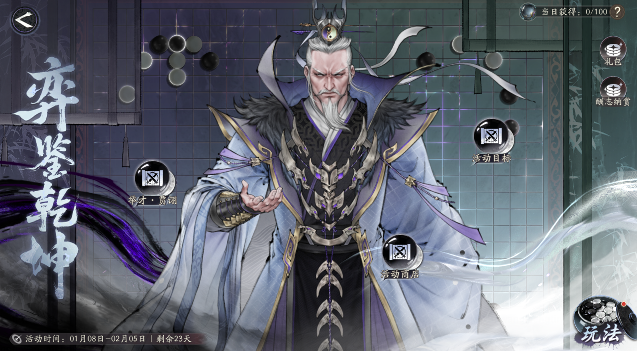 2、新增主题活动“弈鉴乾坤”,所有服务器同步于1月8日06:00:00至2月5日05:59:59开放,体验贾诩在乱世中的抉择,收集活动积分“玄素铢”兑换举才诏、龙骧之印、兵营材料箱等多项奖励;