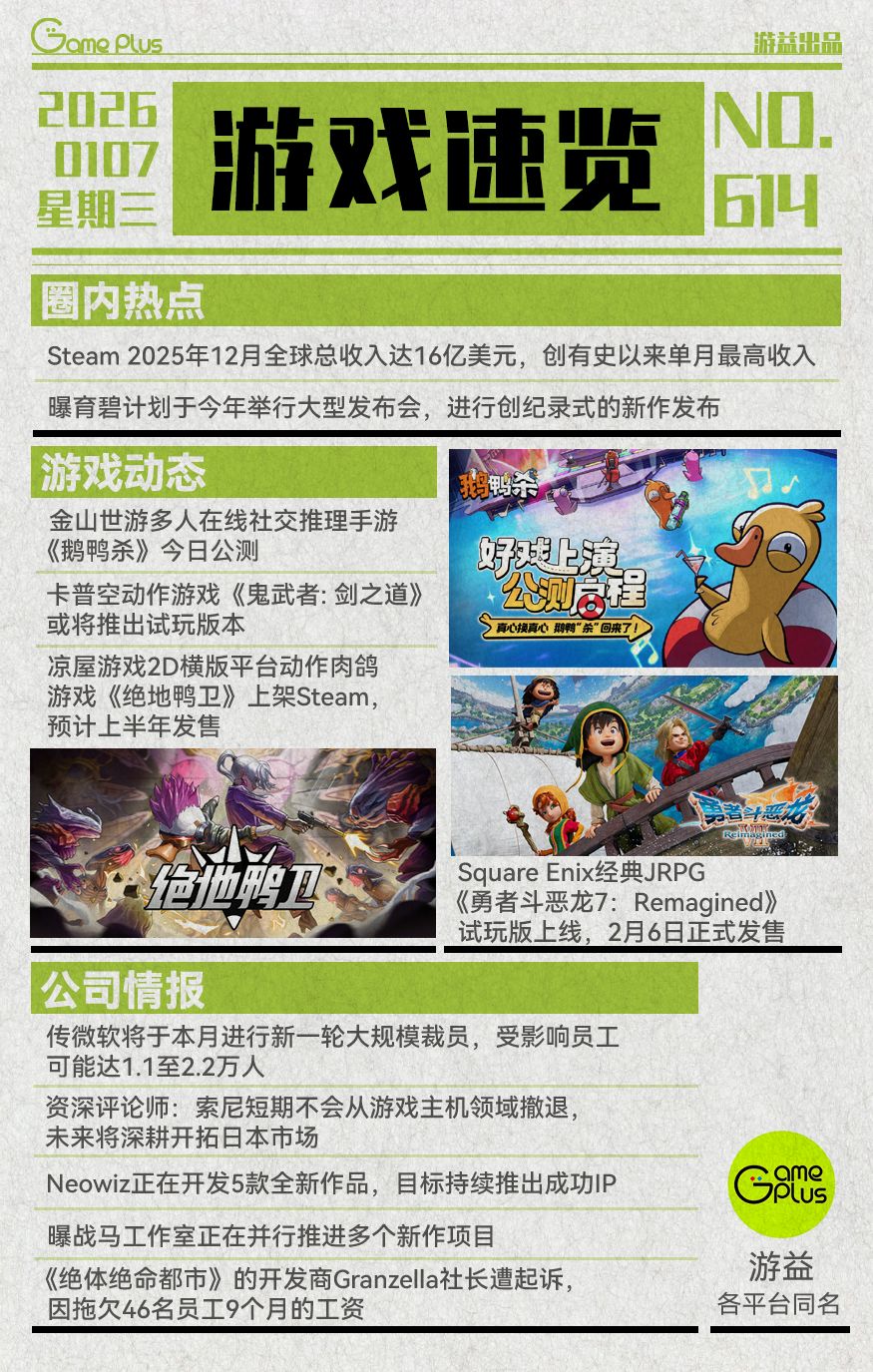 1.Steam 2025年12月全球总收入达16亿美元,创有史以来单月最高收入