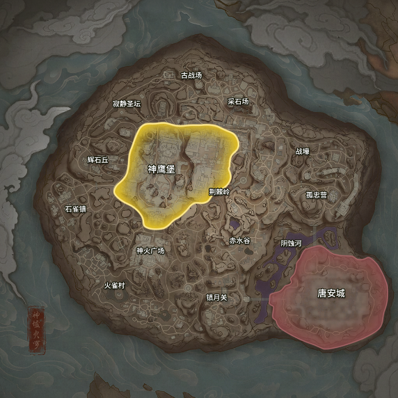 地图由13个区域和2个高资源区组成,其中神鹰堡和唐安城是核心资源区;每个区域都蕴含丰富机制与奖励,更有惊喜和彩蛋等待探索!