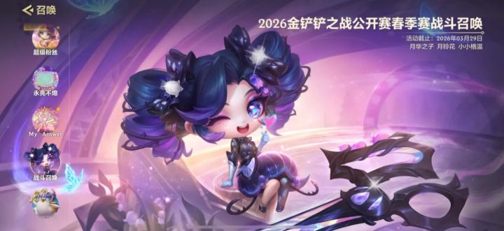 近日,金铲铲之战在2026年1月初推出重磅福利活动,玩家可免费获得12次召唤机会,有机会抽取最新神话级小小英雄【月华之子 月铃花 小小格温】,这一活动属于游戏战斗召唤系列,免费机会包含一次十连抽和两次单抽,让玩家几乎零成本体验抽奖乐趣![[TapTap表情|TapFamilyxdoro2_粉狗比心]](https://img-tc.tapimg.com/market/images/101c7e3200596fe8e03765080b467fb8.gif)