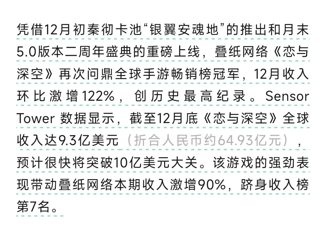 在表单中,身为乙女游戏界的神,《恋与深空》在12月接连推出秦彻卡池、无遮拦围裙牢夏卡池、二周年卡池,在哥哥们的努力下,《恋与深空》狂澜近9.3亿美刀(折合近65亿元),击败一众一般向、男性向大制作,荣登月收入第七的位置!