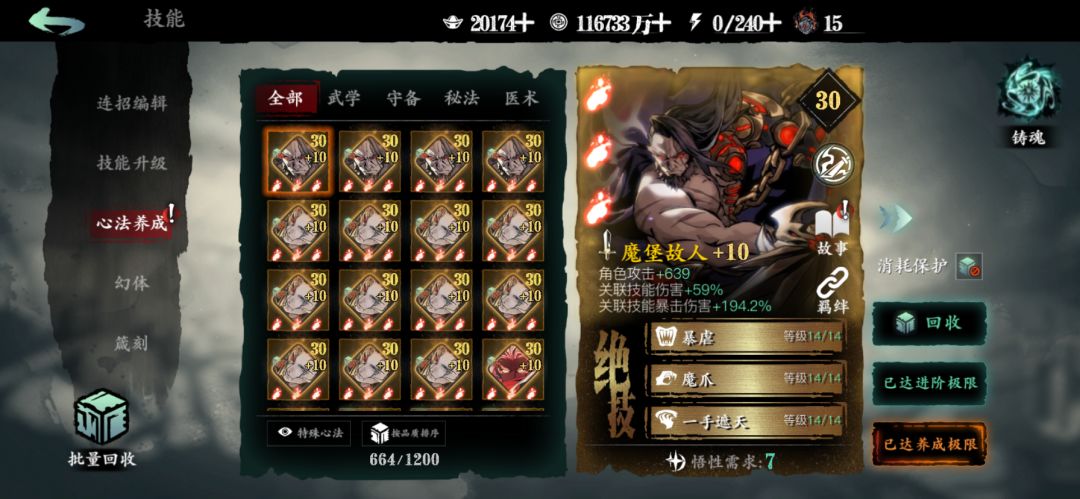 目前稀有获取渠道大幅度增加,有稀有橙碎念。能让玩家更快的提升稀有橙铭刻等级。武学以万魔为主,因为他pve有加伤。守备以月堡为主,因为没有稀有橙守备心法加蚀灭,其他加蚀灭的都是红卡,做不起。秘法跟医学都用普通红卡,醉青鸾跟圣手。因为他们都能在虚空金豆商店买到,120金豆一张,慢慢攒还是能换的起的。在技能链子有一张圣手跟醉青的情况下,多余的可以拿去升级铭刻,因为所有红卡铭刻一级都是加10点蚀灭,你放到技能链上只有7点蚀灭,所以多出来的可以拿去升级铭刻。