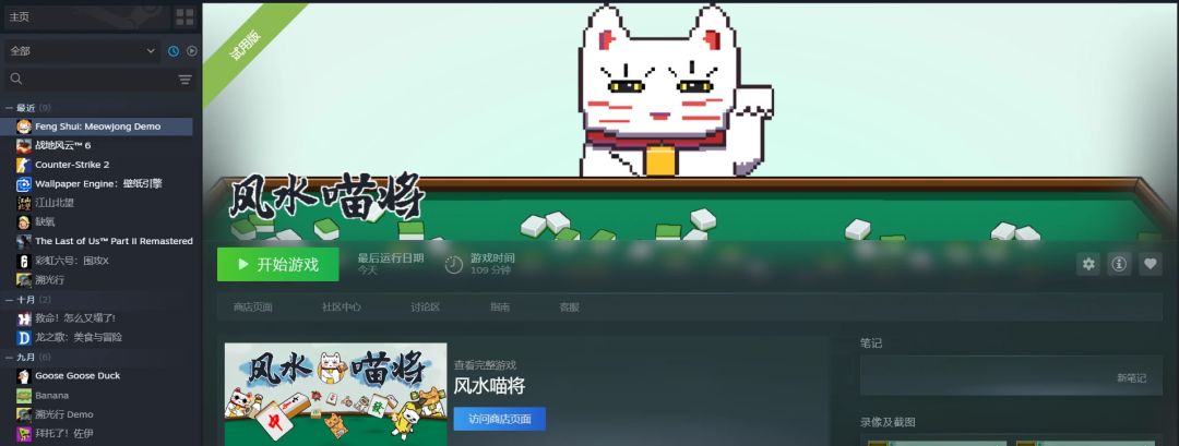 结语最后再说一下游戏的名字,个人感觉算是锦鲤这个月看见名字起的最好的独立游戏了《风水喵将》游戏四个字几乎全部都有运用,“风水”代表麻将中运势的时好时坏,以及背景四季的变化,“喵”就是哈基米!“将”既可以有麻将都意思,也可以代表游戏中那个具有特色的人物技能卡牌。真妙啊~