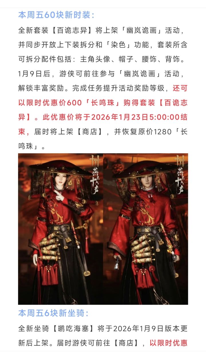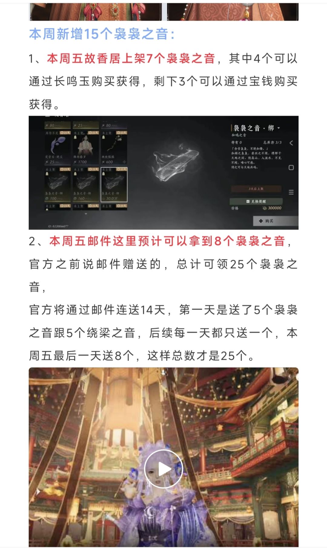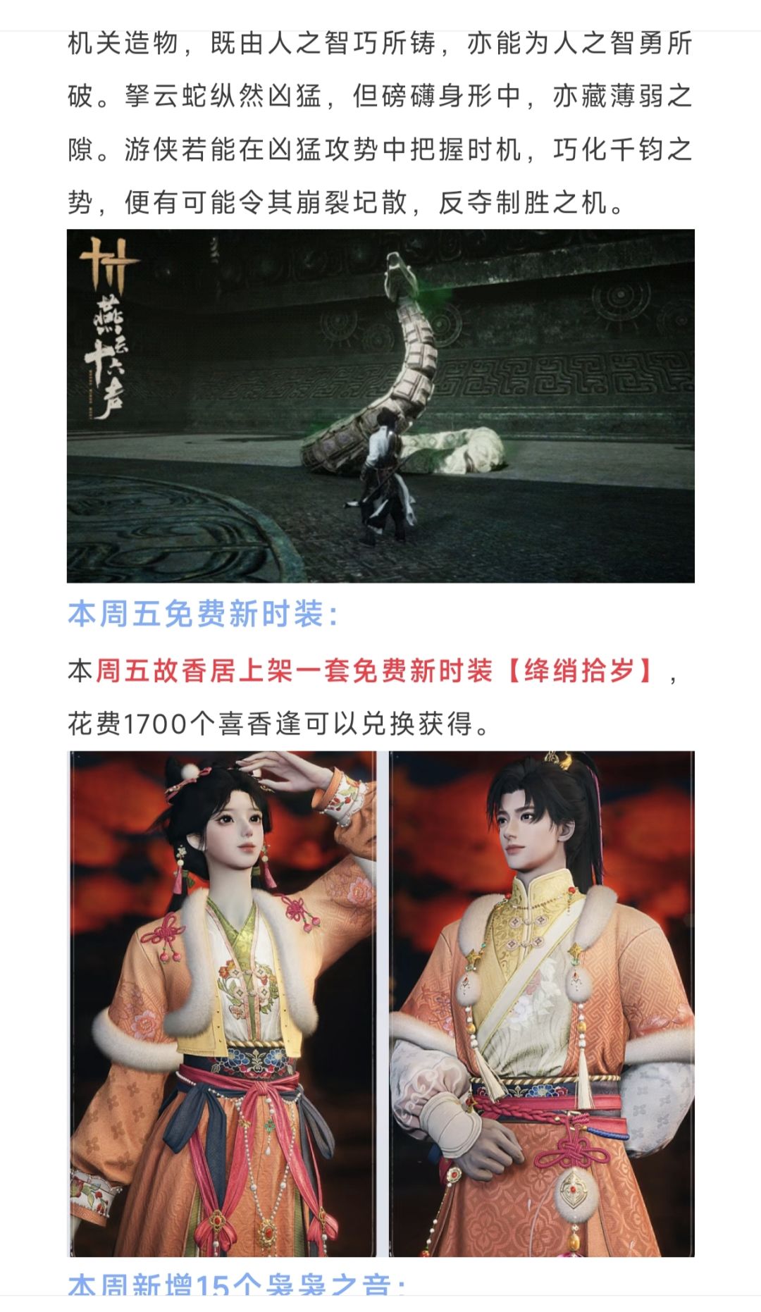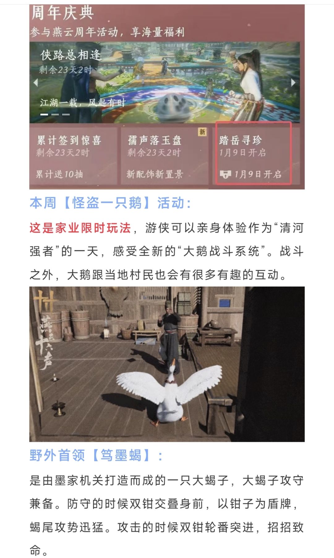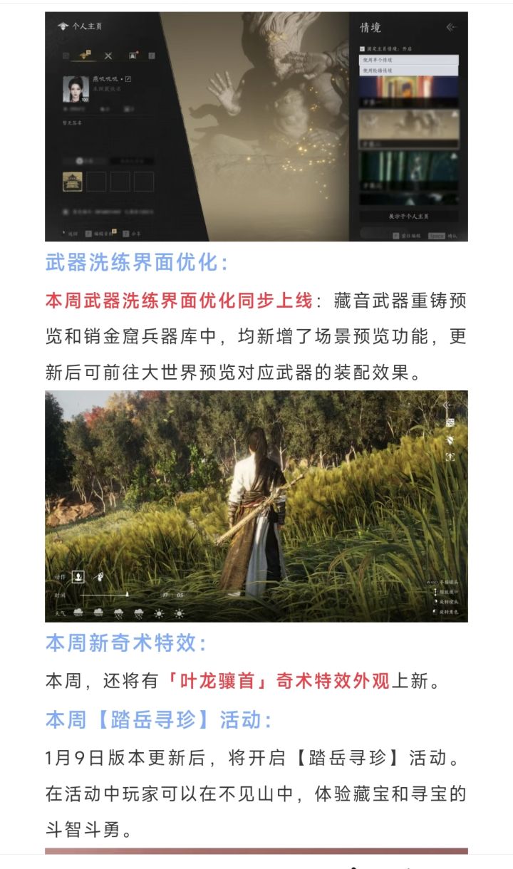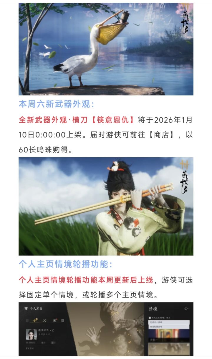 燕云十六声本周五新增15个袅袅之音,新增60块时装,个人主页情境轮播功能,新奇术特效,新武器外观,武器洗练界面优化,家业限时玩法怪盗一只鹅,踏岳寻珍活动!