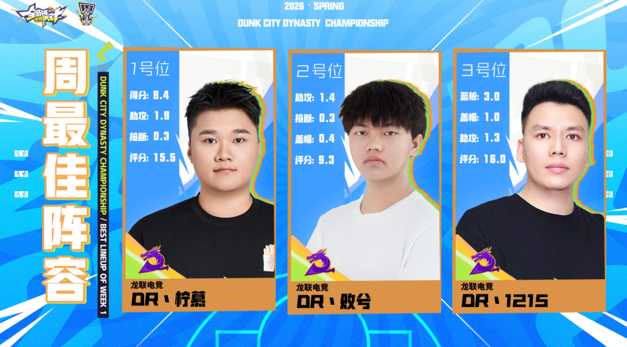 DCDC冠军杯第一周的周最佳阵容也新鲜出炉,夺得最佳阵容123号位的分别是英雄池深厚的DR丶柠慕、防守尖兵DR丶败兮,蓝领魔王DR丶1215,一起看下他们本周的数据吧!