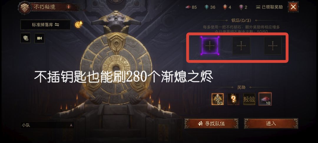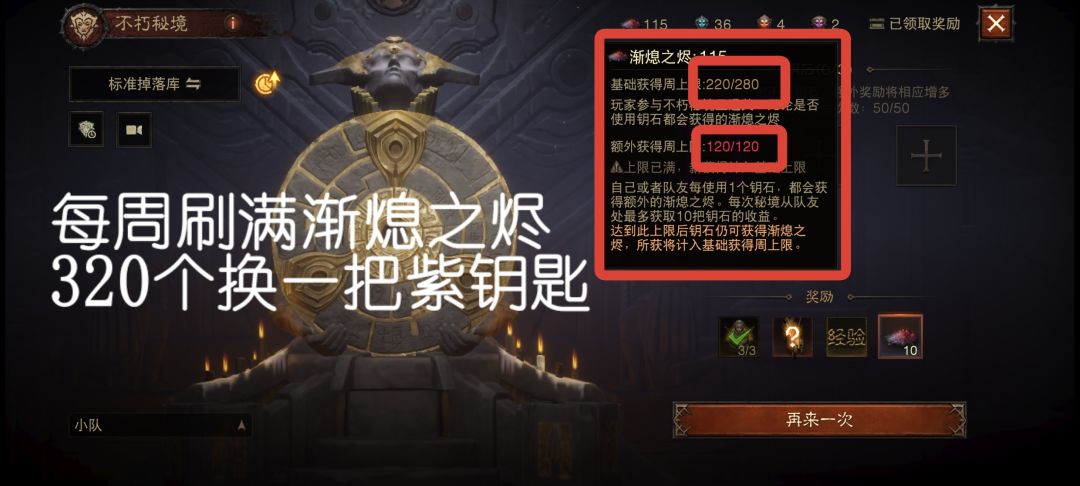 4.10蓝3次来人:指的是打不朽秘境,组4个人,每人插10个蓝钥匙,这样一趟出来,每个人都可以获得40个渐熄之烬,3趟120个渐熄之烬打满一周的额外上限,如果你一个人想单刷满120额外上限,你需要120把蓝色钥匙,但是组4人队你只需要30把即可打满。