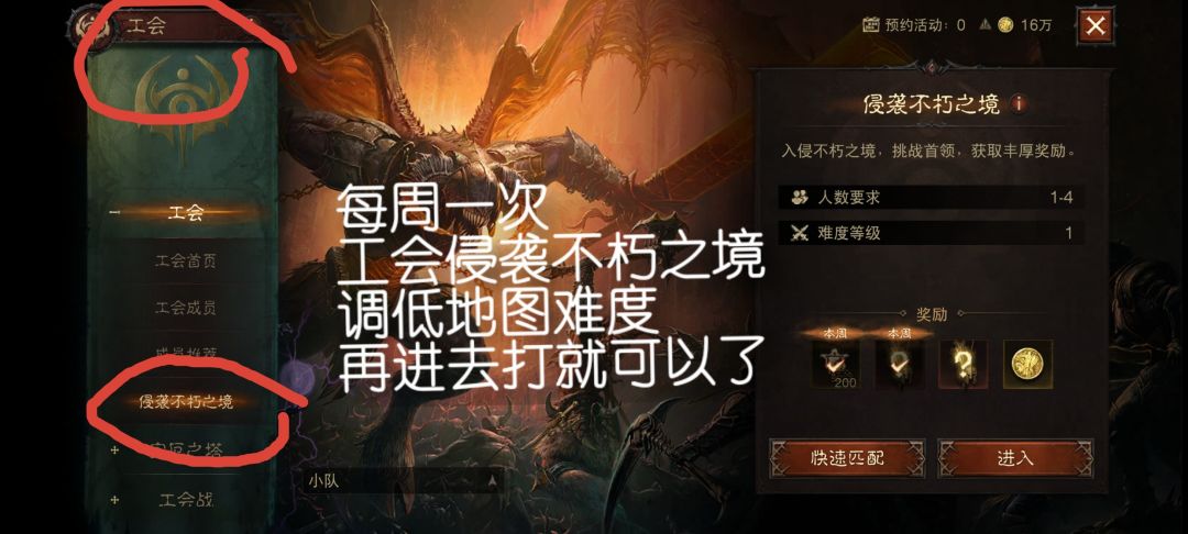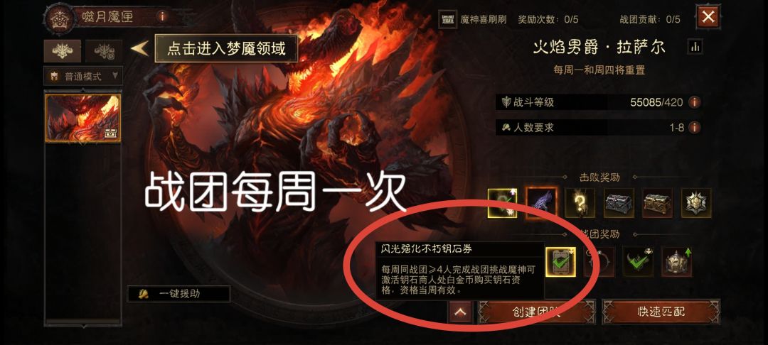 6.带开门:指当自己战斗力不达标时,提前请大佬带自己开地图难度,比如自己巅峰等级已经达到1200级了,可以穿灾厄10的装备,但是自己战斗等级不够,无法击败地图难度的守关魔神,就进不了灾10,那么这时候请大佬带自己开了灾10难度后,自己可以去灾10混装备,比如自己单刷灾10的随机普通副本,哪怕战斗等级不够,只要你一键援助,副本靠机器人打手带飞,自己一路不停的躺尸起来再躺尸,就这样过副本,普通随机副本7次必定给1个绿装保底,不是自己用的,分解,5个精粹兑换一个自己想要的部位,这样可以快速提升自己。