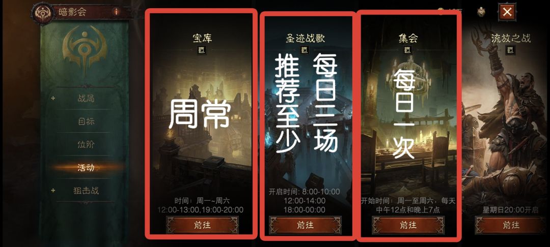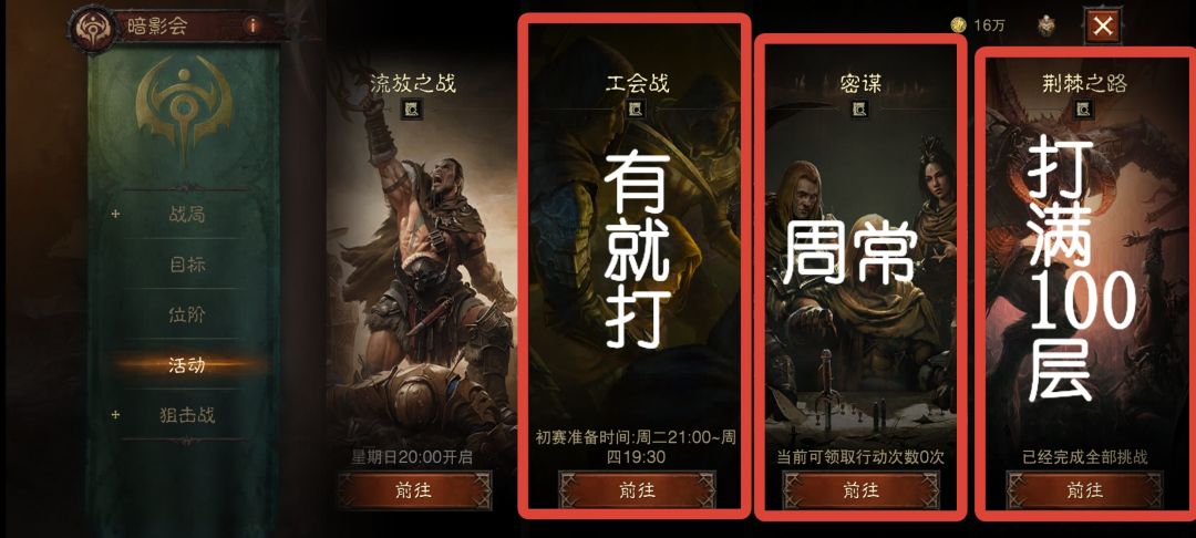 3.J会开始了,快来:说的是暗影会的集会活动,就是进去泡点获取4种祝福,每获取一种都可以领取对应奖励,获取祝福时,可以分享给边上的人,有概率获得传奇装备,不过大多数蓝装黄装,我就出过2~3次传奇装备。因为游戏中“集会”两个字属于违规字,发不出来所以用拼音或者谐音代替如急会,际会等……好奇葩的违规词。