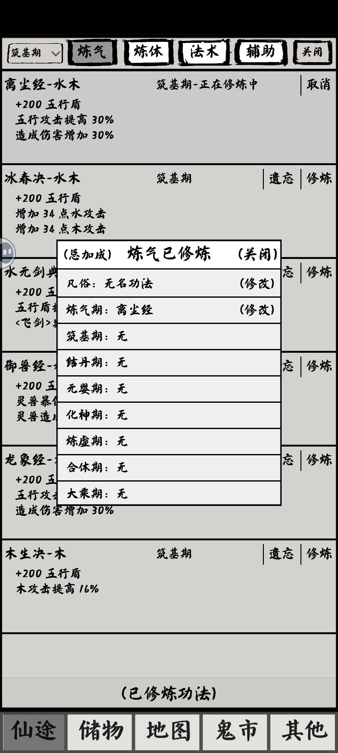———每次突破大境界会根据当前修炼的功法提供永久属性加成。双修练气和练体都可提供,后续想更改需要花费大量 原始真解(法)或 太初真解(体)。如下图