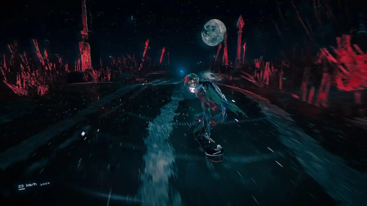 《滑板故事》在视觉表现上非常出色,一方面复古蒸汽波艺术风格,极具视觉辨识度。怎么和大家形容呢,画面看上像是写实的,但是又不够清澈。有一种看上世纪末非液晶显示屏电视的感觉,对就是那种“什么档次和徐江一样等离子电视的肉眼质感”。但玩家高速移动的时候,游戏的画面却非常流畅,有一种电波感。也就是说画面使用了复古风的表现形式,但是帧数却是现代电子游戏的高刷参数。