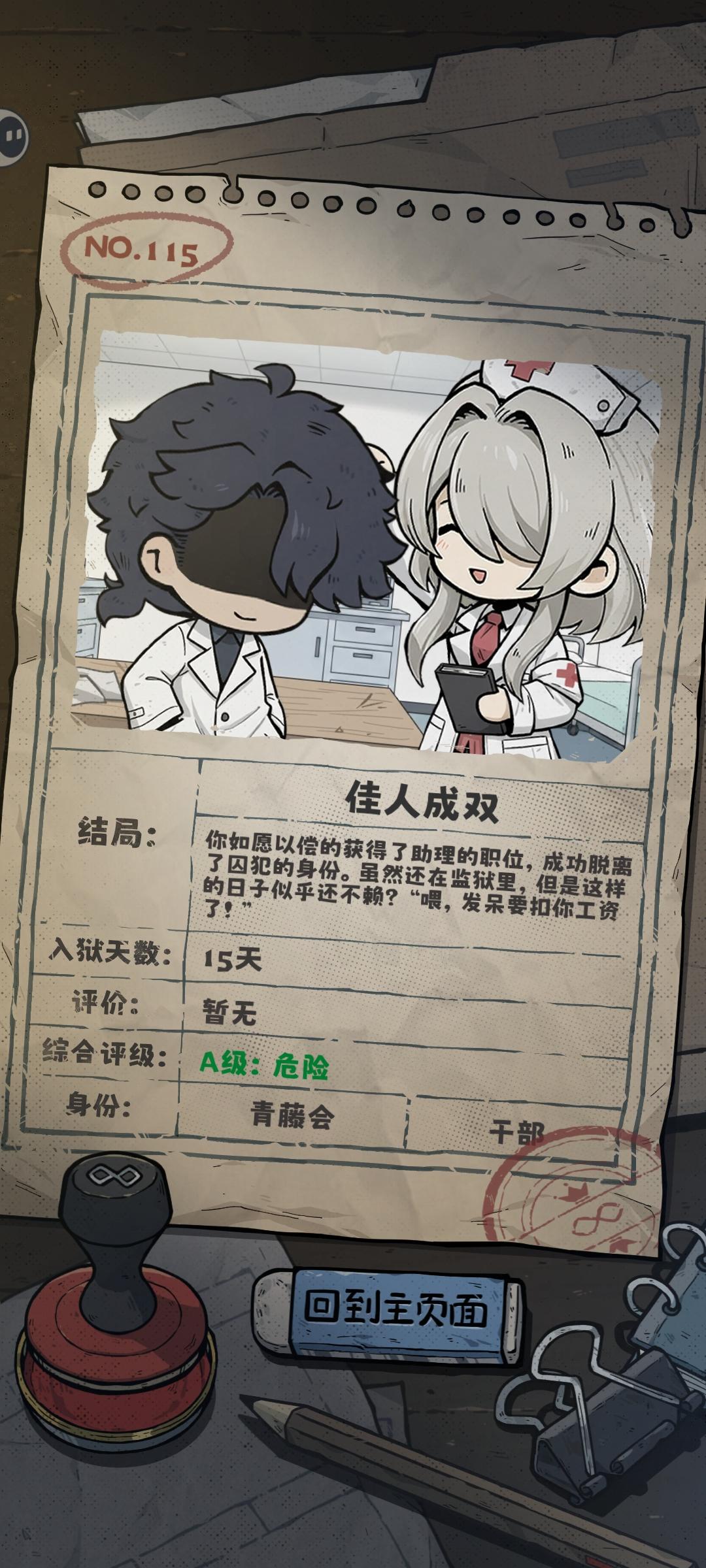 1.与监狱医生好感>200之后,闲聊触发选择此结局【选择此结局后任务限定只有七天可供后续准备⚠️⚠️⚠️⚠️】