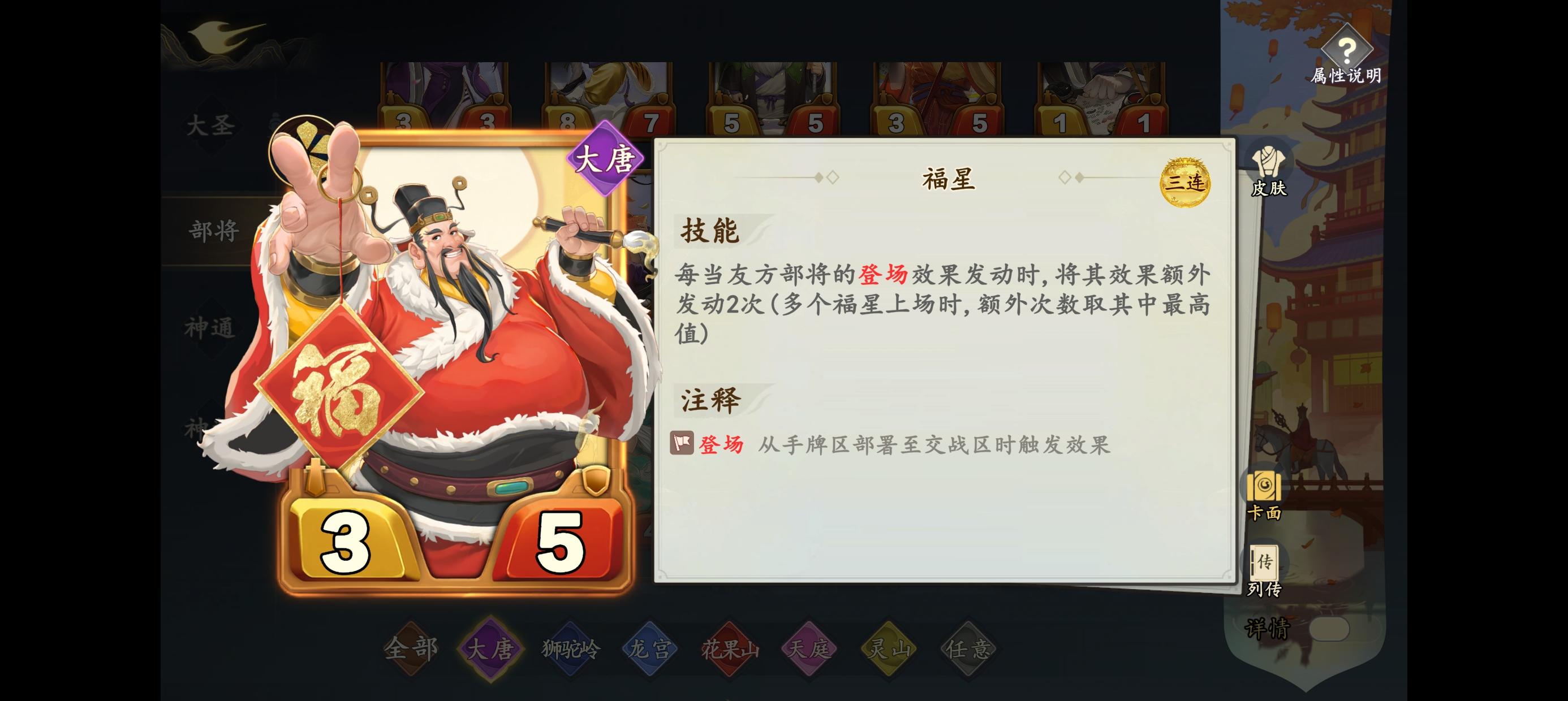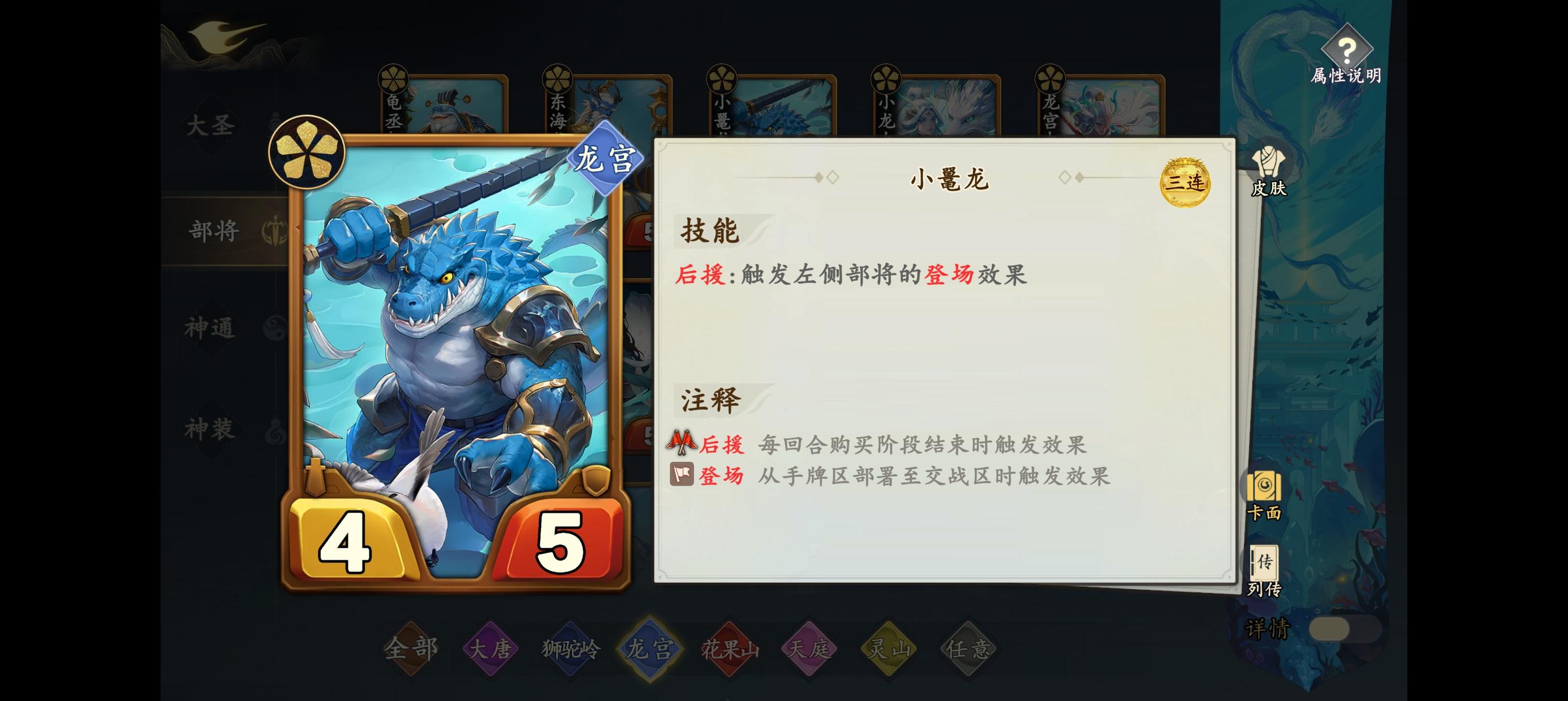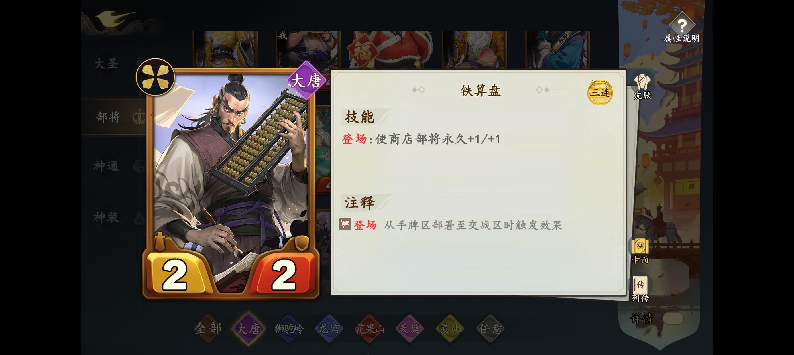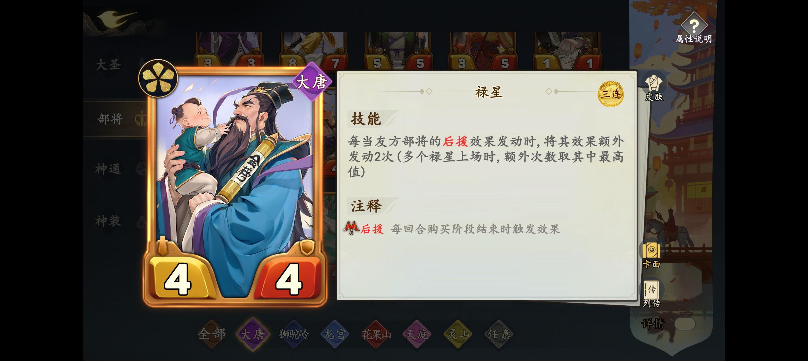 限制更低,只需要狮驼岭,龙宫即可开玩,后期钱花不完,前期强度足够,后期只入人7血,拖长回合数,算盘快速叠商店部将身材,配合孔雀公主大量补充经济