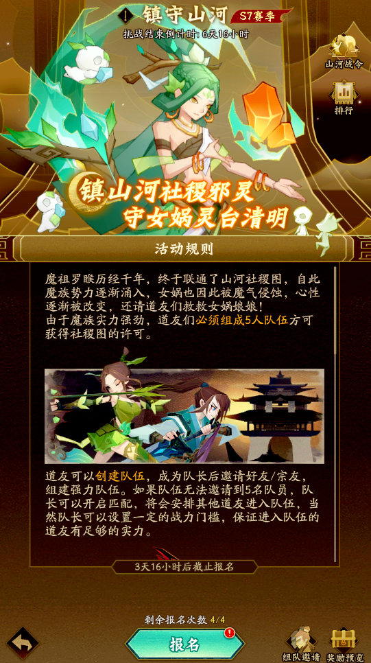 道友可创建队伍,成为队长后邀请好友/宗友,组建5人强力队伍便拥有开启挑战的权利,进入山河世界一同抵御魔族,成功击杀魔族精英后即可获得丰厚奖励。队伍可通过完成「山河任务」提升战队等级,提升队伍实力的同时,还将获得神魔伙伴碎片、海量元宝奖励。
