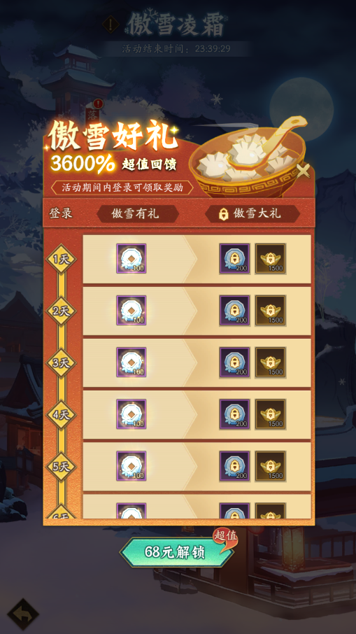 3600%超值回馈「傲雪好礼」限时来袭!活动期间,每日登录即可领取免费【凌霜币】!【凌霜币】可用于【傲雪商店-活动】内兑换超值好礼~道友们还可解锁「傲雪大礼」,领取海量元宝以及更多【凌霜币】等超值好礼~!