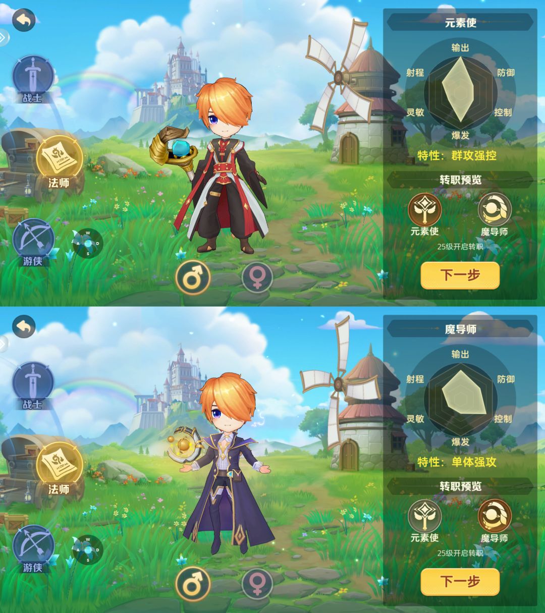 法师转职:元素使(群攻强控)、魔导师(单体强攻)