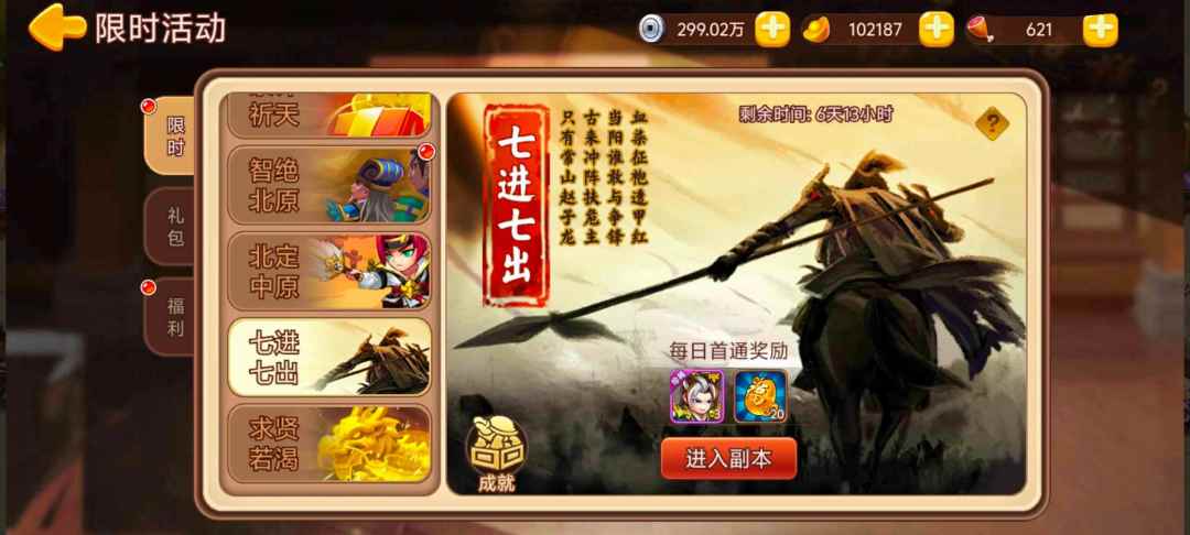 活动内容:活动期间开放“七进七出”限时副本,每日首通获得奖励。