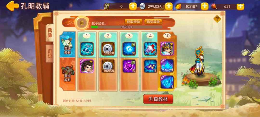 活动内容:活动期间开放新一期孔明教辅,完成任务即可升级教辅等级领取奖励。 活动免费解锁普通教材,花费点券可升级重点教材,获取额外奖励。