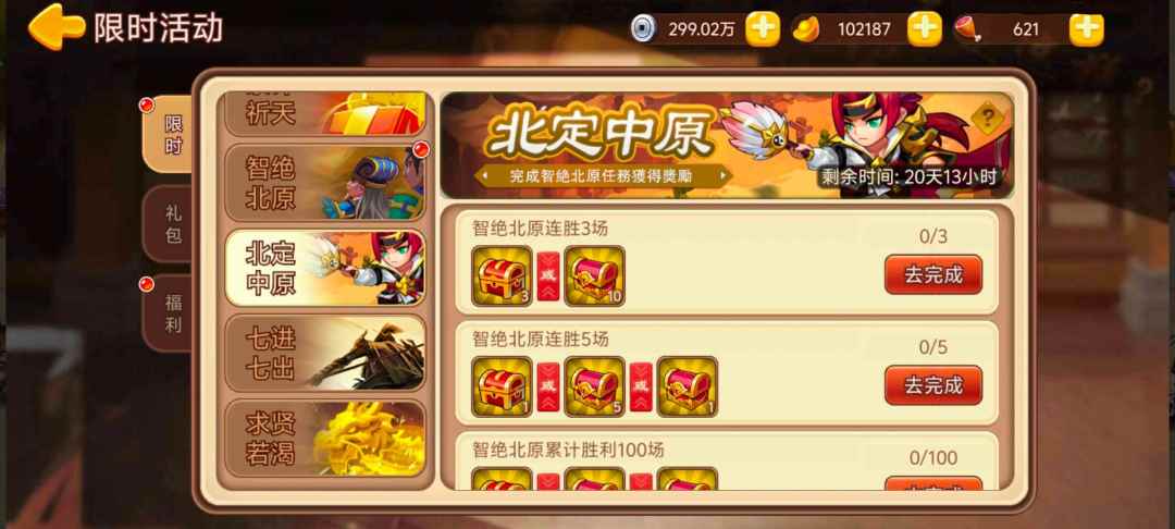 活动内容:完成智绝北原任务,领取额外奖励。连胜任务每日刷新,可多次完成。累计胜利任务仅可完成一次。