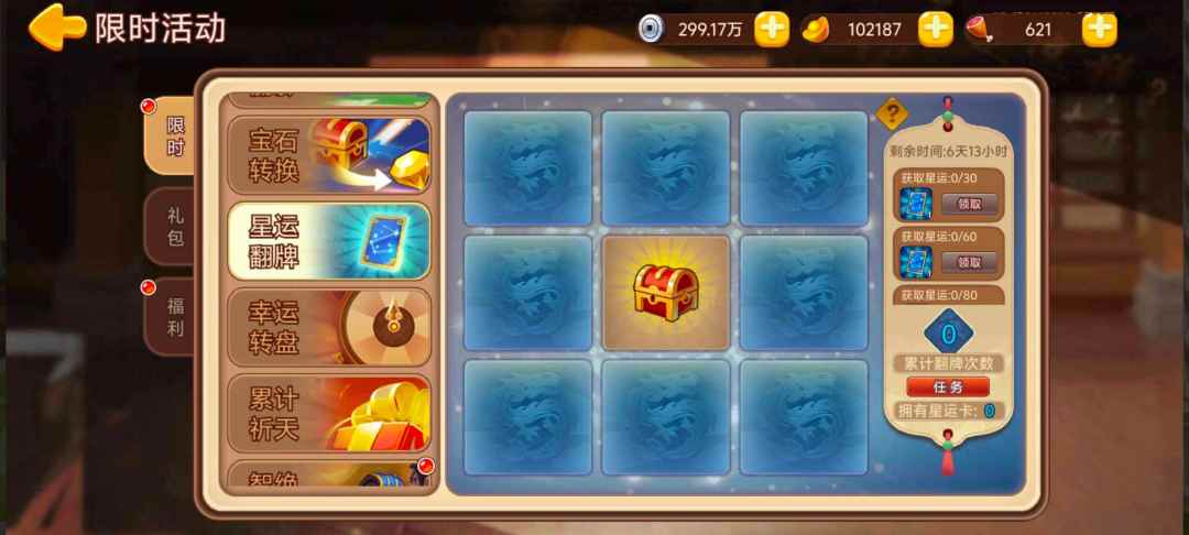 活动内容:活动期间通过完成每日任务获得星运卡,消耗星运卡进行翻牌获取奖励。