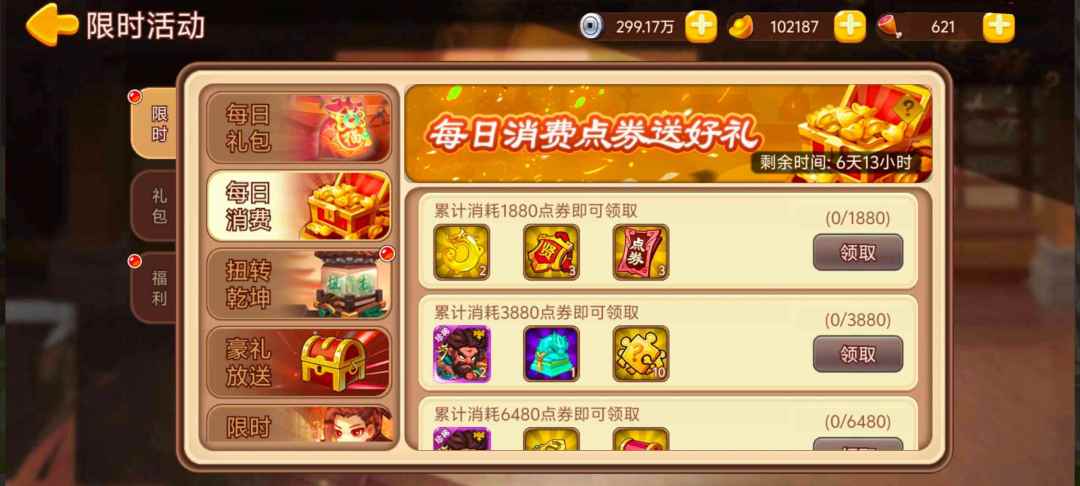 活动内容:活动期间每天累计消费至指定额度,即可领取奖励。次日0点重置消费进度和奖励。