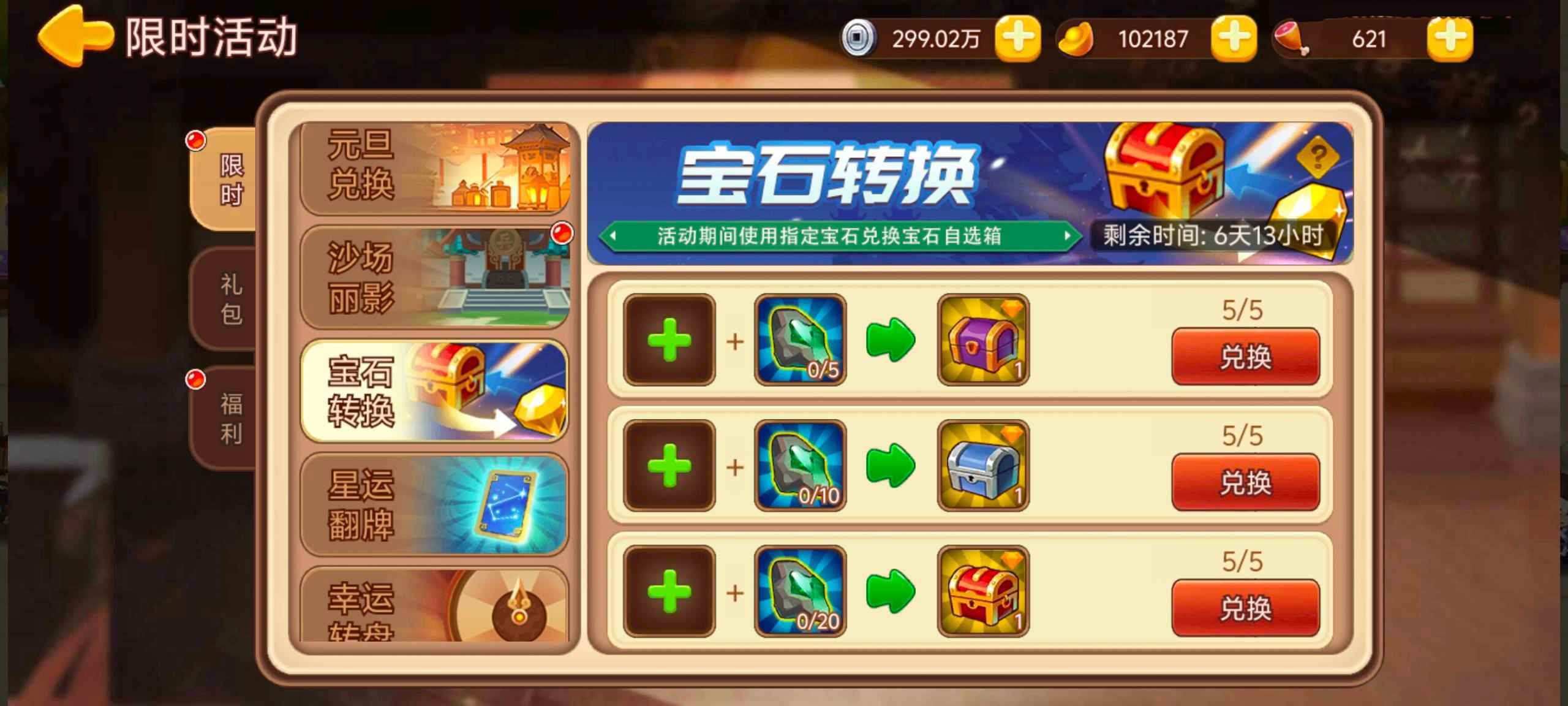 活动内容:活动期间可将7-10阶的宝石使用原石转换成对应等级或对应价值的宝石自选箱。原石每日野外战斗小概率掉落(每日上限10)。