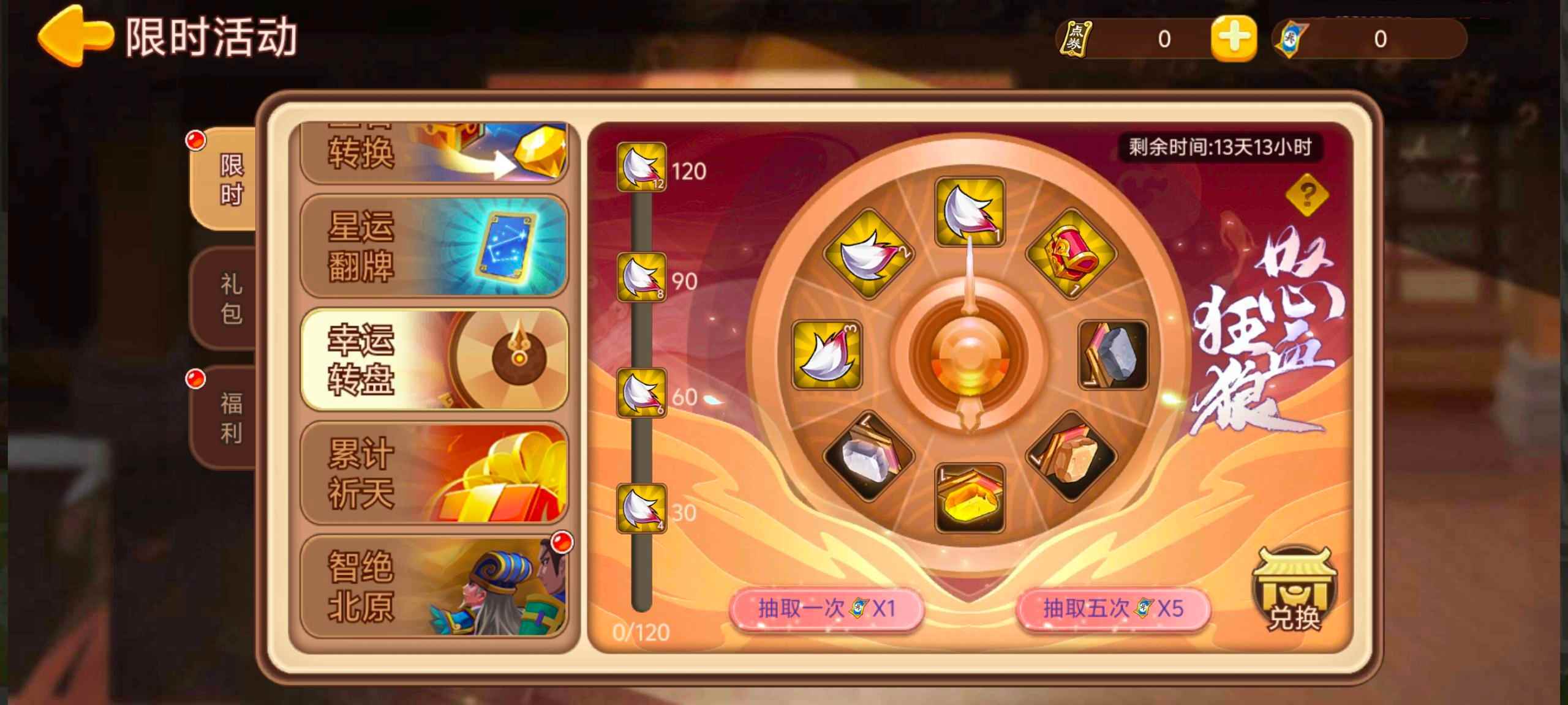 活动内容:活动期间,开启血狼套幸运转盘。 使用1个兵者符可以转1次,转盘抽得活动道具可以兑换成套装部件。完成累计转盘次数可以额外领取兑换道具。