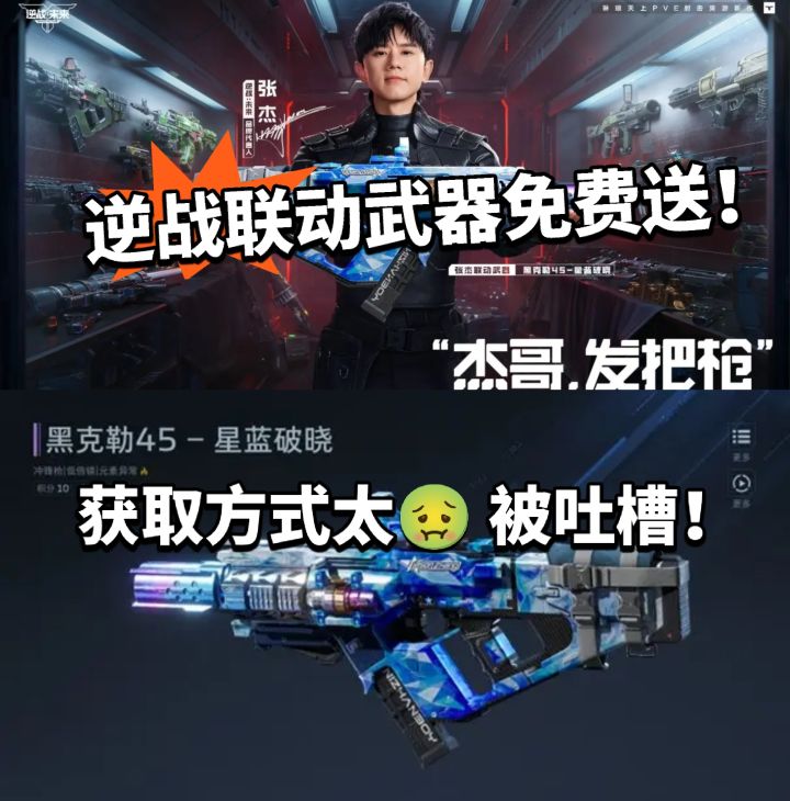 大的来了家人们!近日逆战手游和张杰的联动算是彻底翻车了!本来喊着“人人都有枪”的口号,说要送杰哥限定枪械【黑克勒45-星蓝破晓】,结果领取条件一公布,直接引发玩家大量不满。