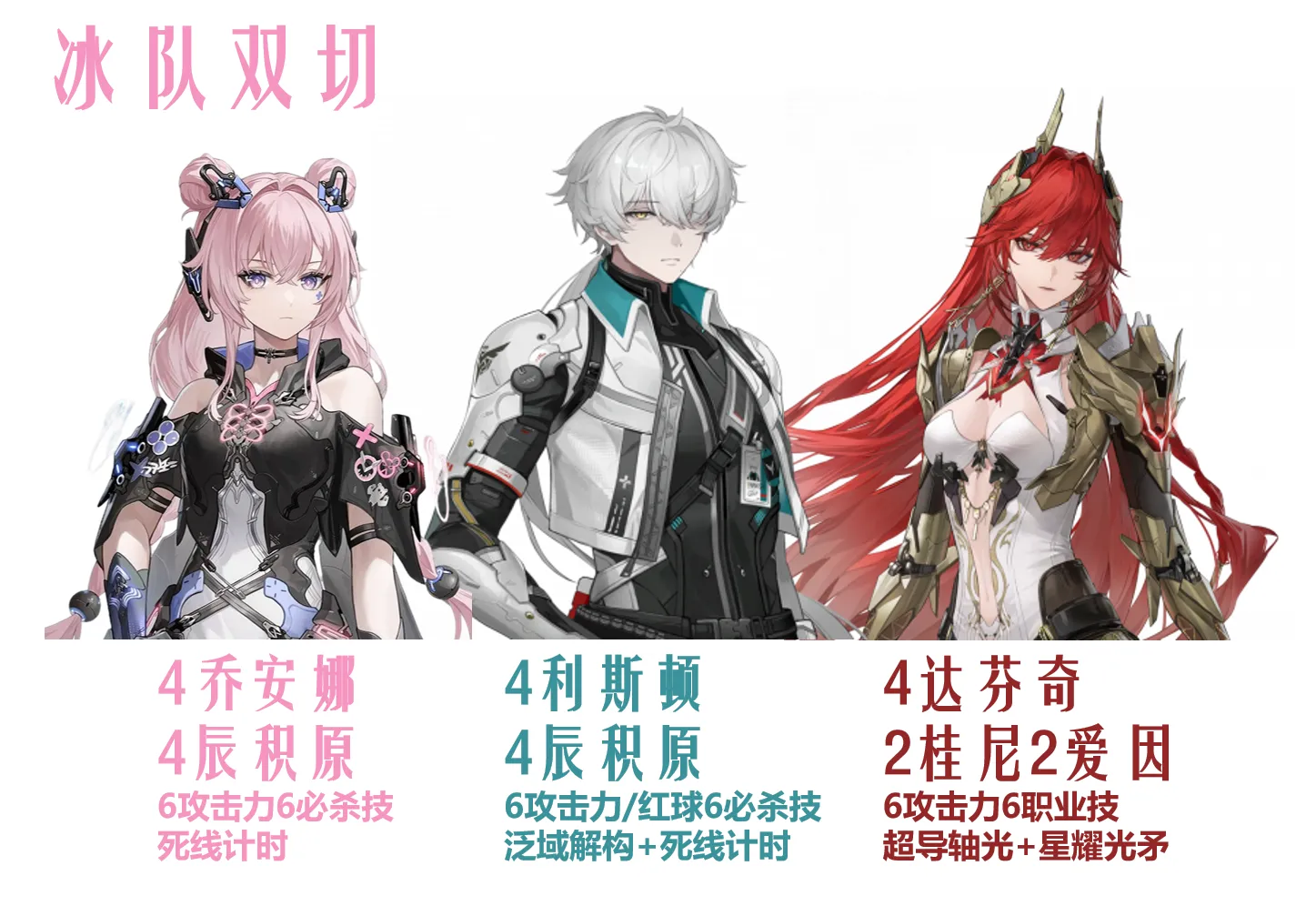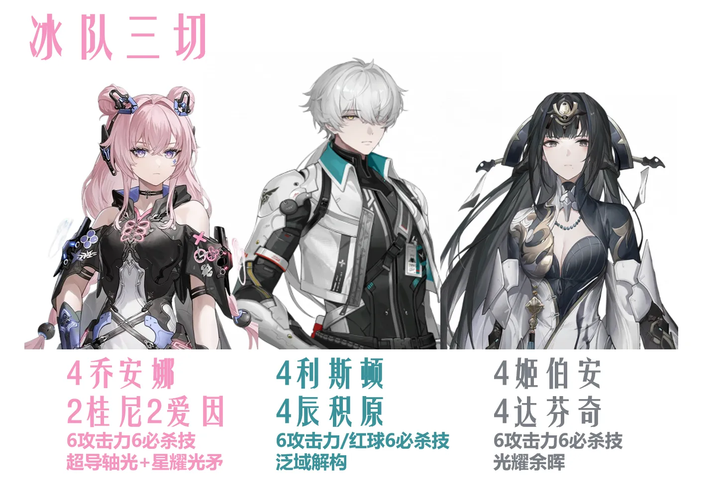冰队当前的两位核心角色,布偶熊骇影与万事明晰梦,均能免费获取,骇影更是专武辅助机一整套全送。布偶熊与万事搭配任意增幅工具人,即可组成双切队伍。