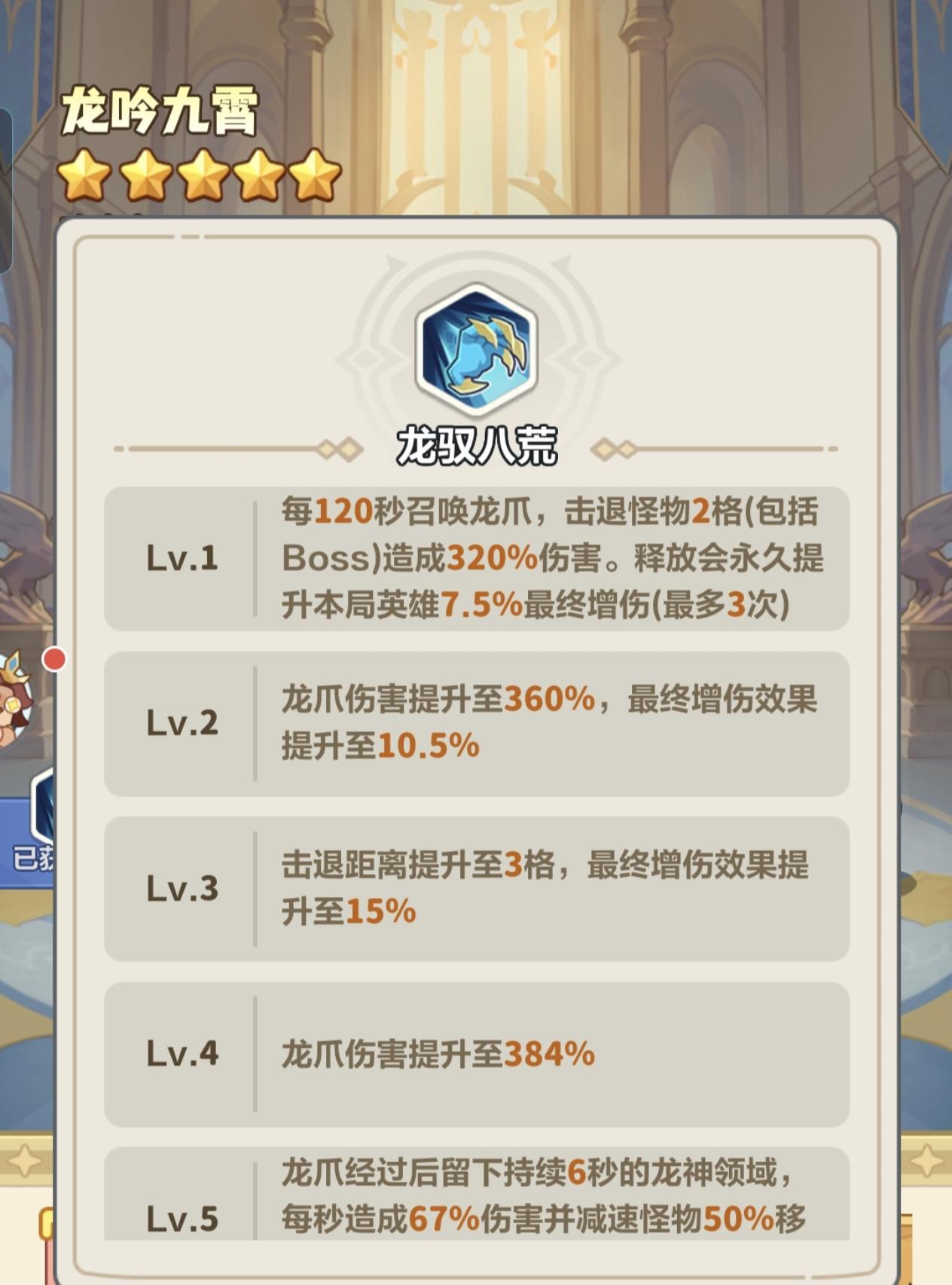 其次,第二款推荐的皮肤那必须是我们帅气逼人的龙皮:龙吟九霄。作为游戏唯一免费赠送的一款传说皮肤,3星高达45%的最终增伤(单次15%,可叠加3次)自带击退跟最终增伤于一身,你又有什么理由放弃他呢,你只需要的就是囤囤囤!!!