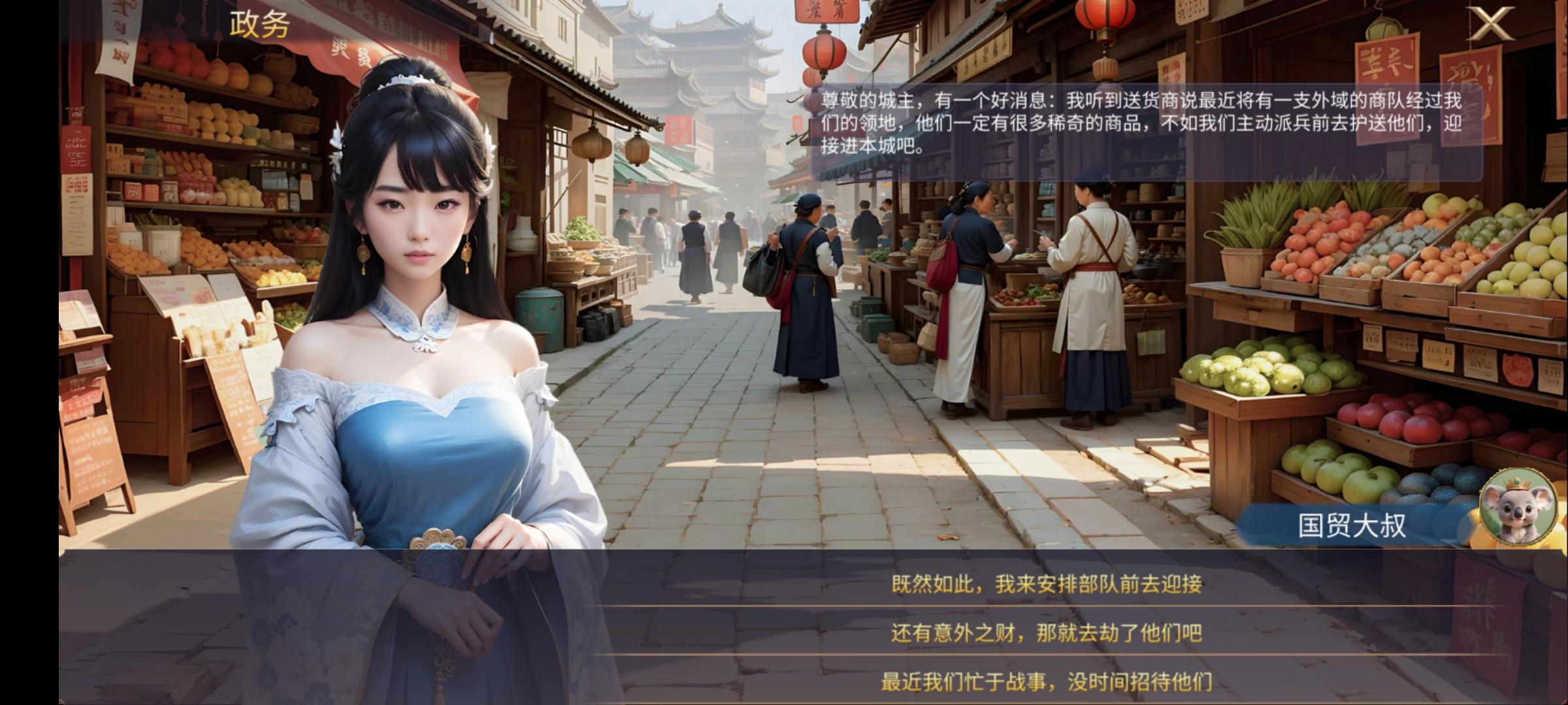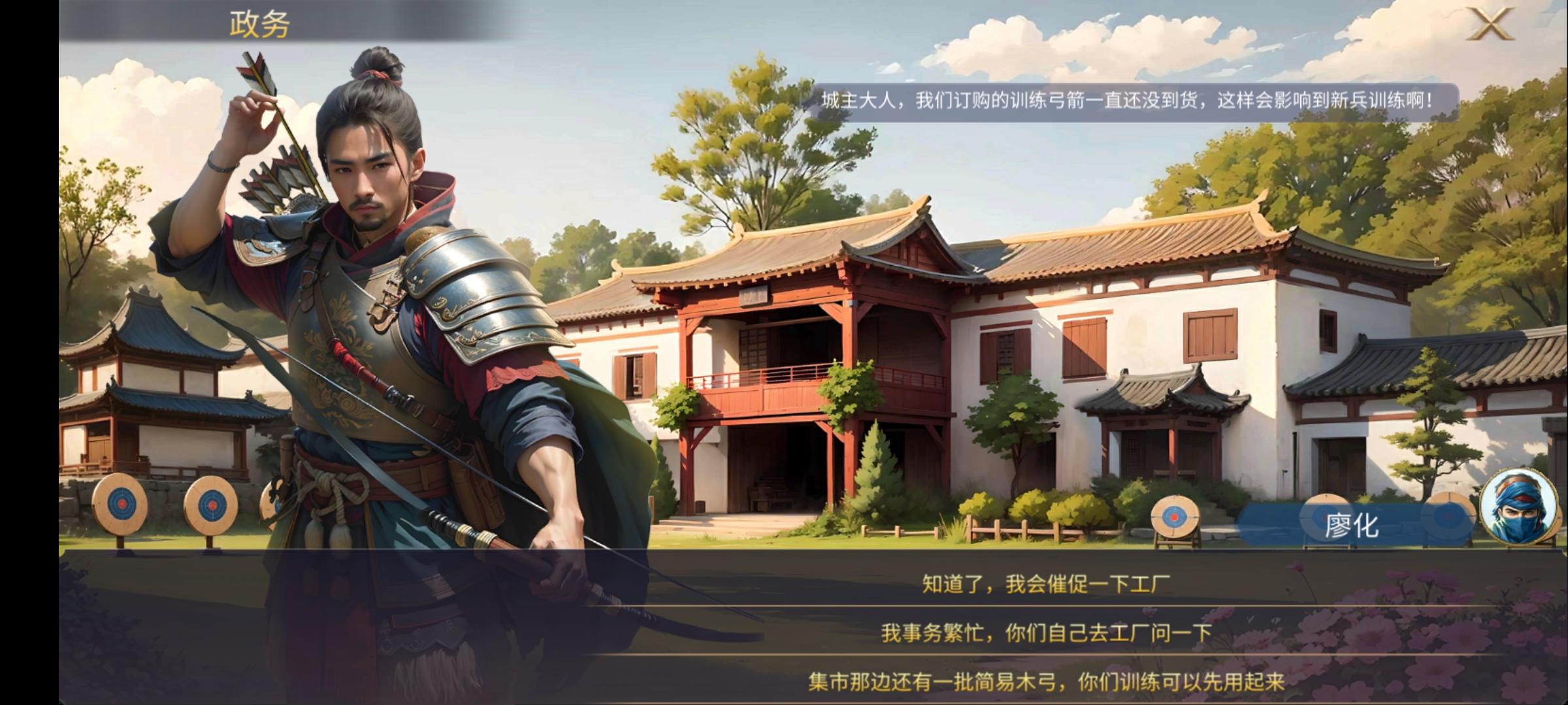 选择:集市那边还有一批简易木弓,你们训练可以先用起来。可获得:弓兵预备兵800、安定值+2