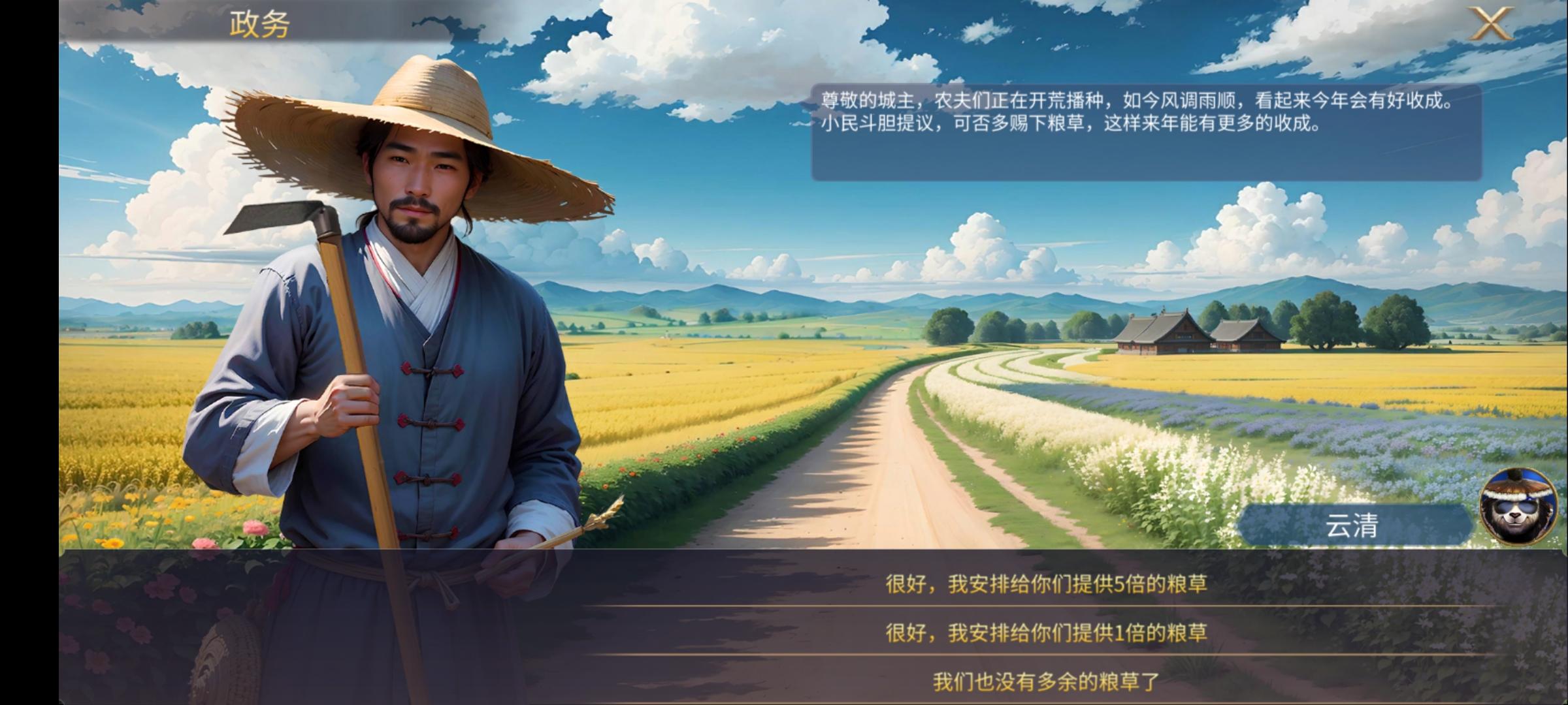 选择:很好,我安排给你们提供1倍的粮草。可获得中级经验书10,中级经验书15、粮草1万、安定值+2、繁荣值+2