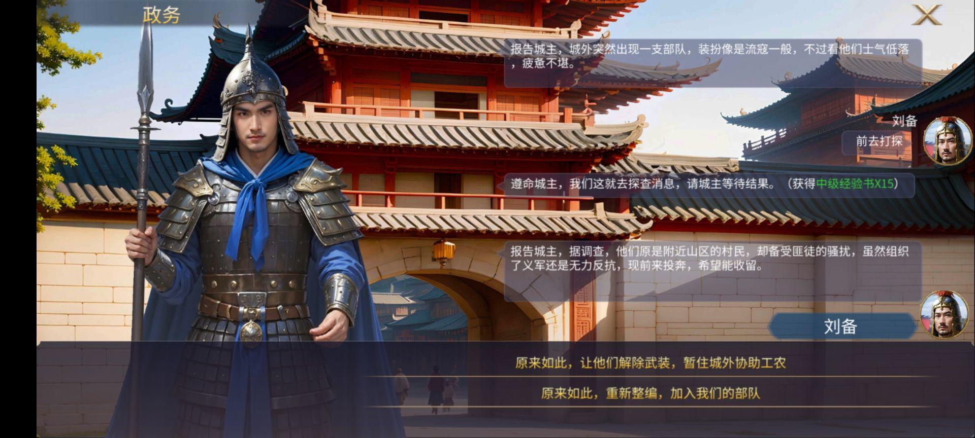 选择:据报城外还有一些流寇、你们与卫兵一起小心行事。可获得:中级经验书5,中级经验书15、弓兵1500、安定值+4