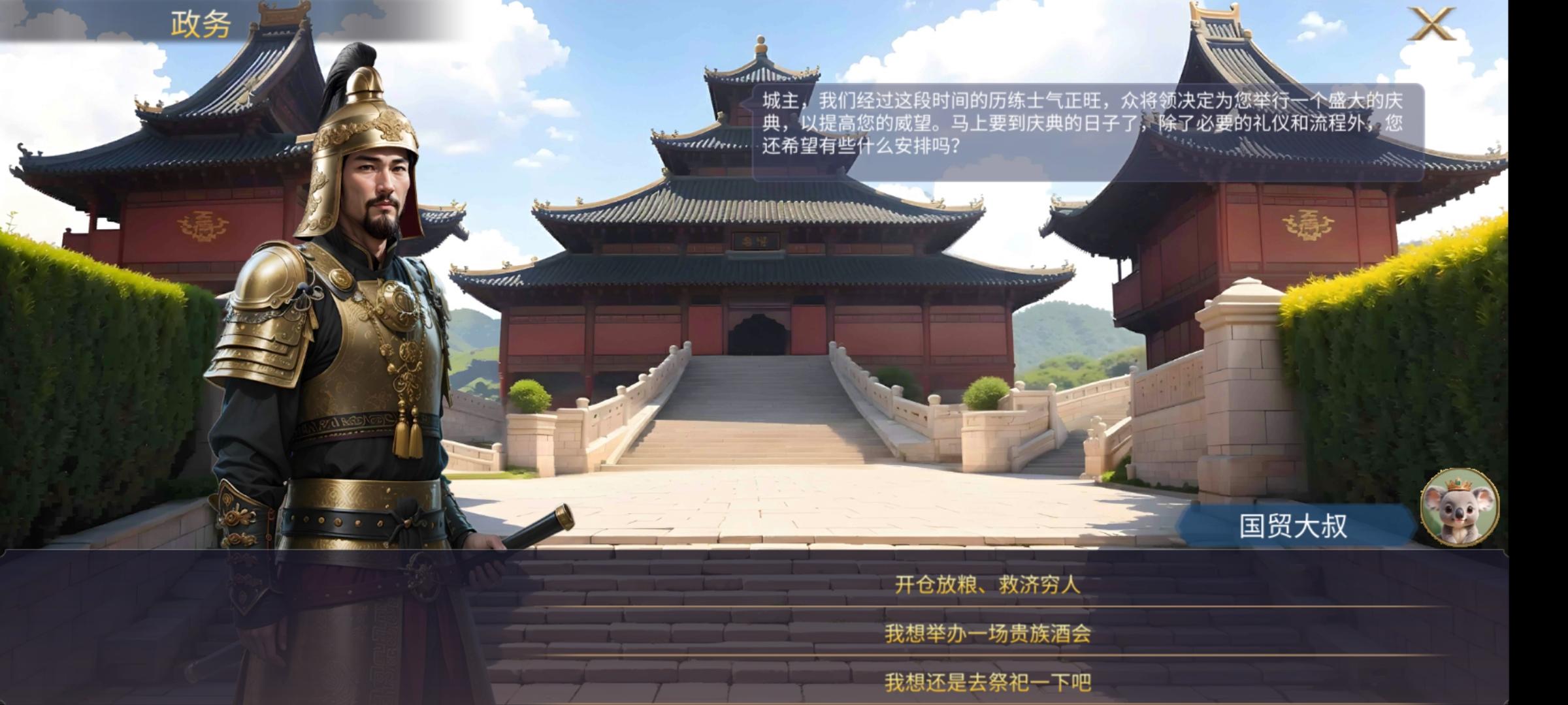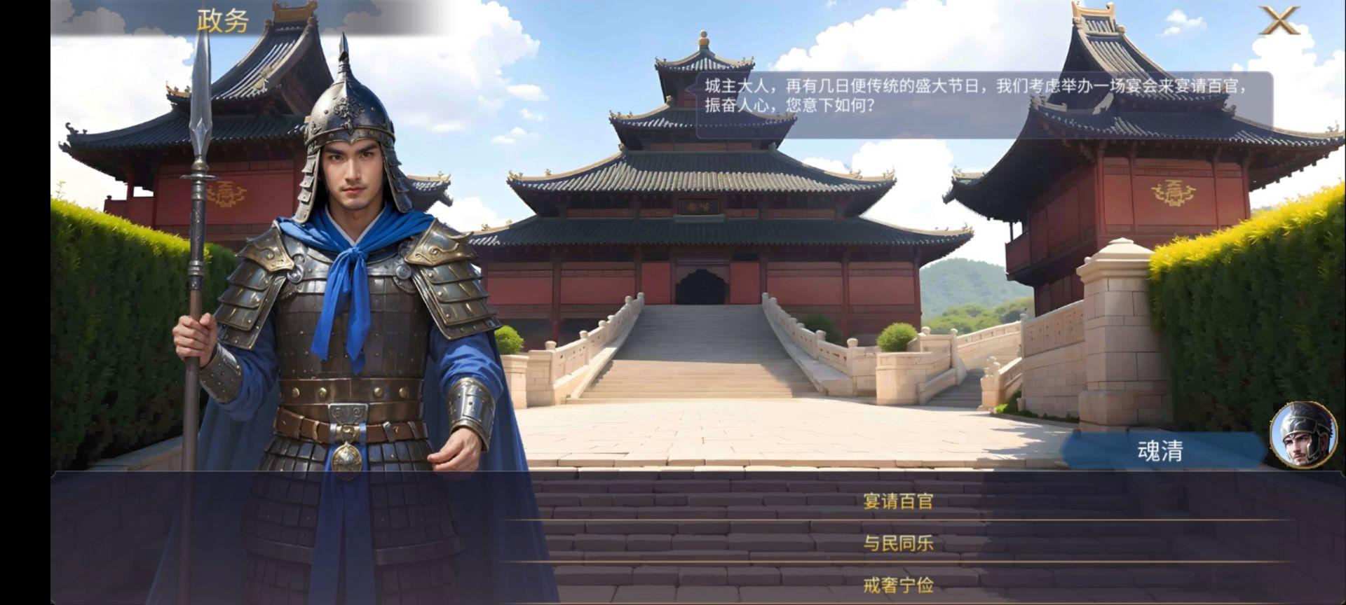 选择:宴请百官。可获得:银币1万、中级经验书10、安定值+1、繁荣值+1