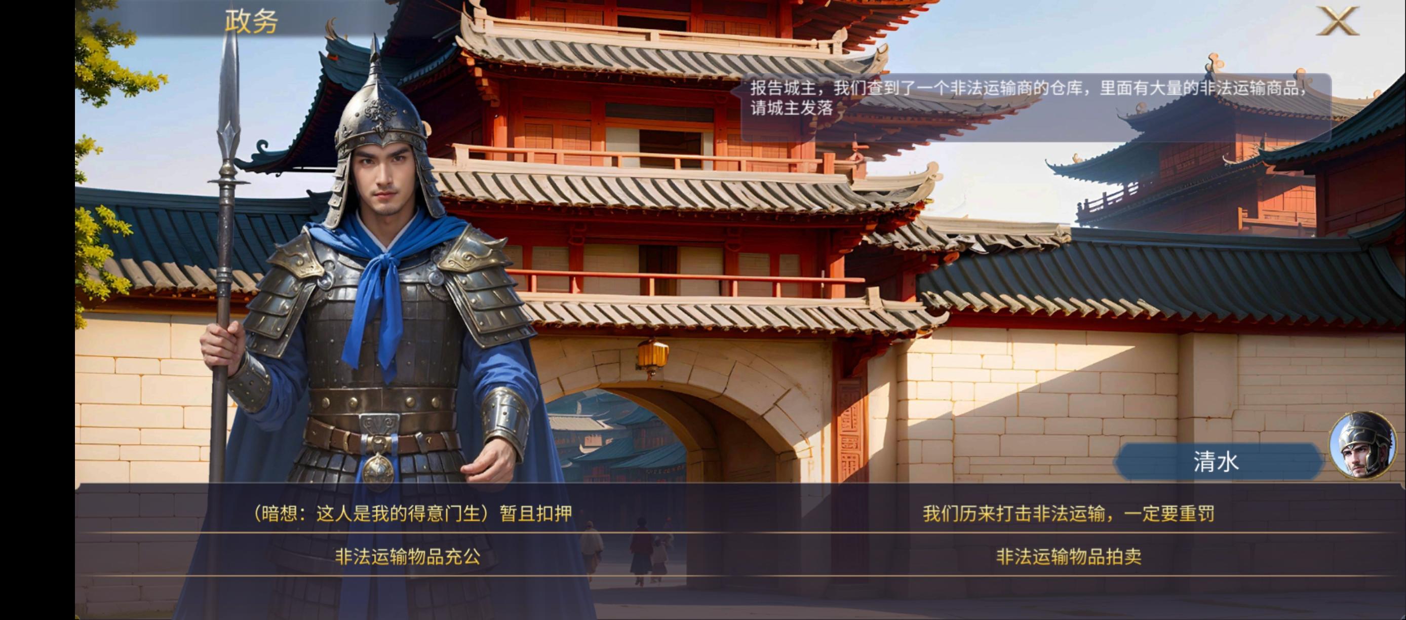 选择:非法运输物品充公。可获得银币10000、安定值+1、繁荣值+1