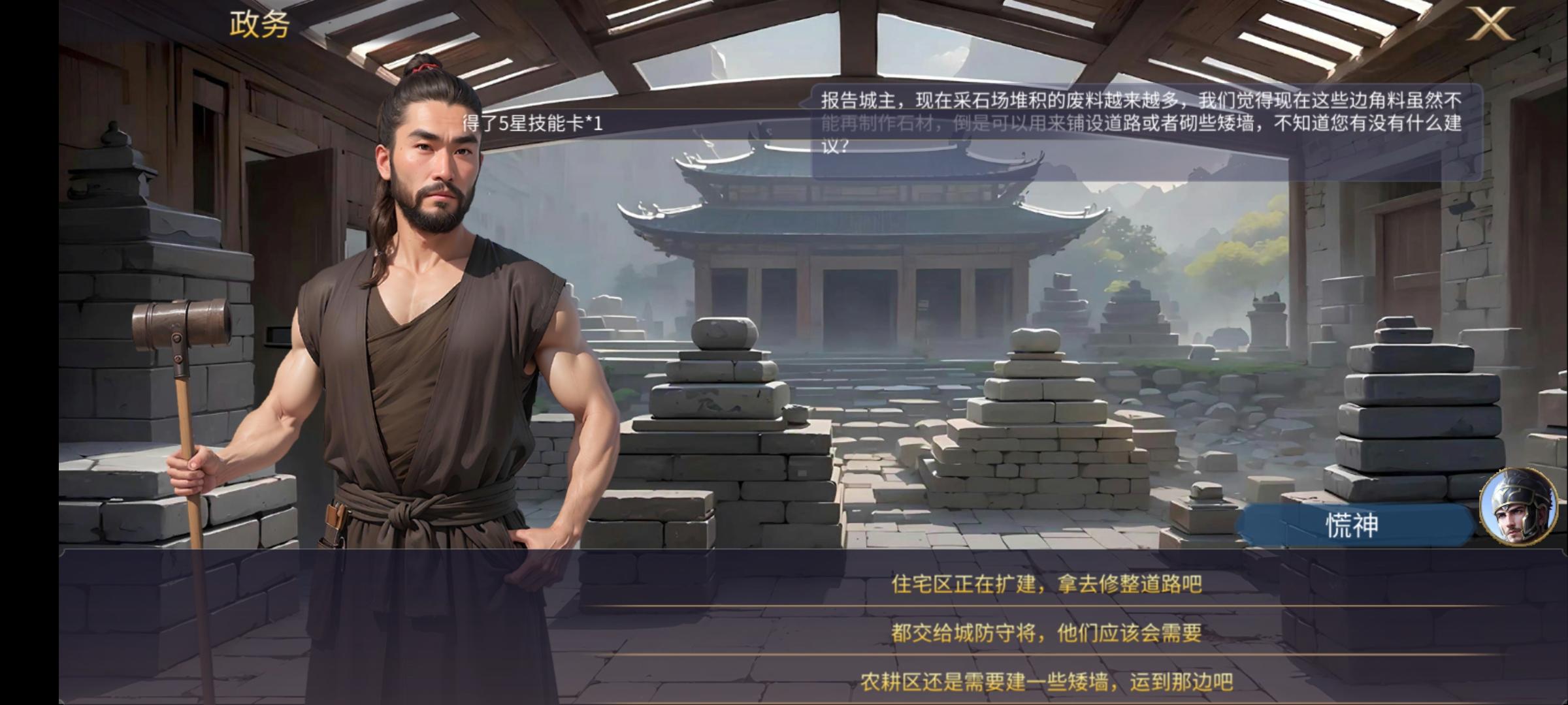 选择:农耕区还是需要建一些矮墙,运到那边吧。可获得:石料5000,石料10000、安定值+1、繁荣值+3