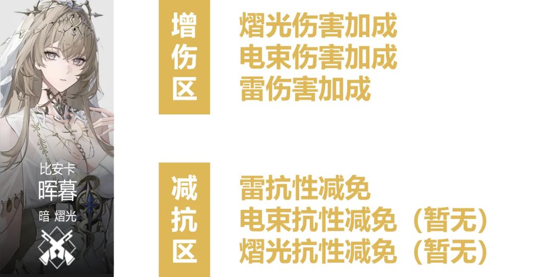 熠光伤害享受雷和电束全额的减抗与增伤效果,享受部分弱雷与弱电束的弱点加成。当前版本。熠光没有独立的战区,使用环境在雷和电束区。在雷区,熠光晖暮是霁梦的下位替代。在电束区,熠光晖暮可以和誓焰平分秋色。对于低配账号来说,熠光能作为雷和电束环境的通解。对于雷和电束两队配置已经比较完备的玩家来说,熠光则较为鸡肋。