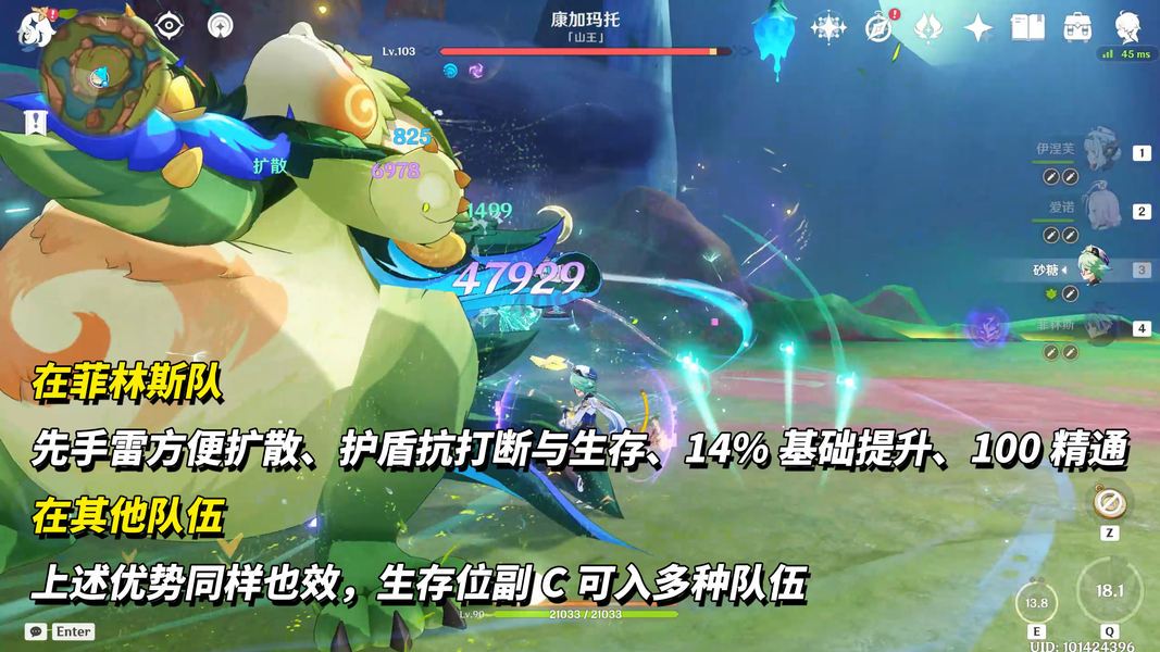 ②持有许多后台副C或辅助的玩家,如菈乌玛、爱可菲、茜特菈莉、纳西妲之类,那维莱特可灵活构建“纯水、蒸龙、冻龙、月感电、绽放”等玩法,极大程度发挥你手中角色用途。