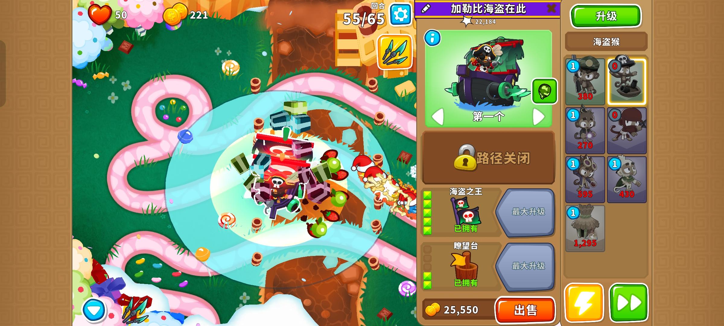 岛1:很简单,只需在中间位置放下001海盗猴,逐渐升到042,最后用技能钩下MOAB就行。如果怕漏气球就补上其他猴子!