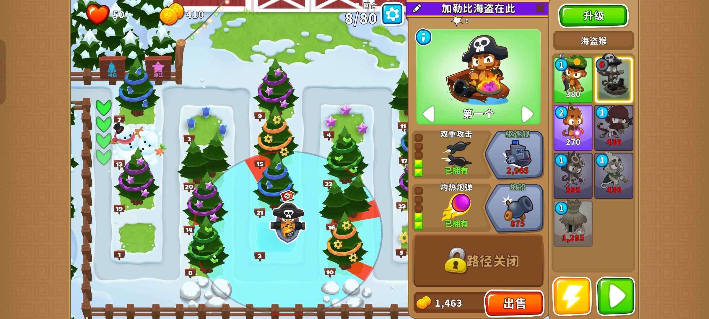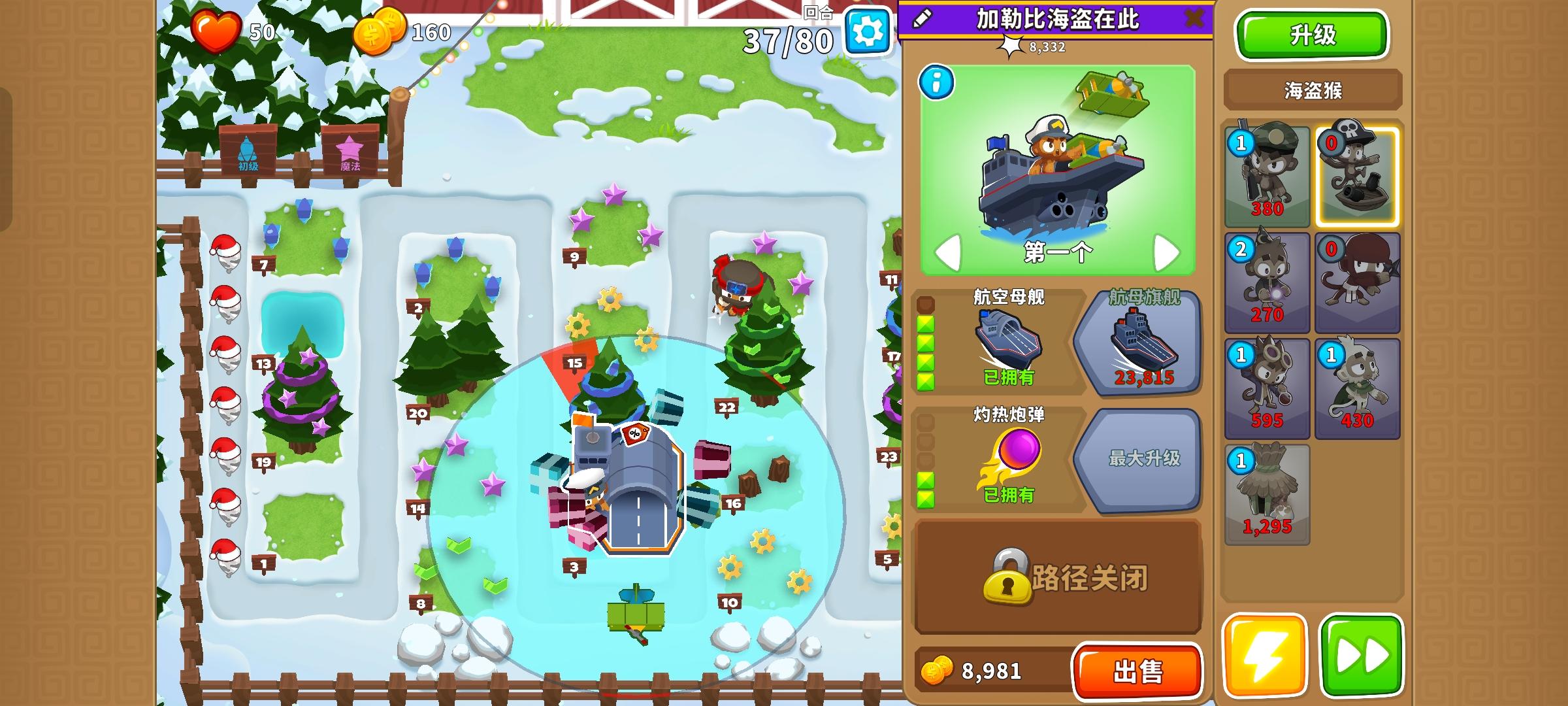 岛3:开局在下方水域的右上角处放下220海盗猴,先升到320,再在4号位置放下忍者猴打迷彩,逐渐升到201。再把海盗猴升到420打飞艇,击败后在旁边的位置来个220猴子村辅助它。之后优先在16号位置的右下角处放下420狙击手猴控死飞艇,再把海盗猴升到520,然后在16号位置的左上角处放下420炼金术师,同时辅助它俩。最后把狙击手猴升到520就行!