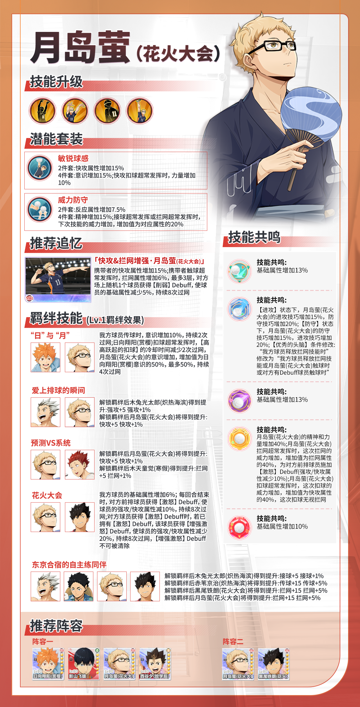 🎆 带你一张图了解「月岛萤-花火大会(MB)」适合的潜能套装、适配的追忆、技能共鸣介绍、角色独特羁绊、优质阵容组合!