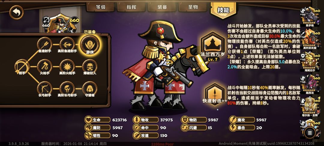 综合看是通用强力节限,弓法杀将第一C,增伤是弓法痛点,拿破仑虽然也没解决,但他有无视减伤,不存在高氪体系中打不动人的情况,触发血伤只要不是无敌锁血就必死,全员自带锁血、吸血,输出环境好,还不吃站位。