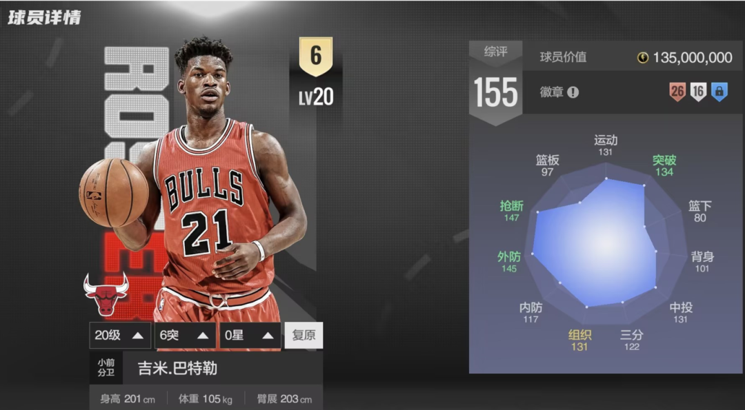 巴特勒的雷达图上,外防和抢断格外突出,145的抢断,搭配银持球抢断大师徽章,防到对面怀疑人生