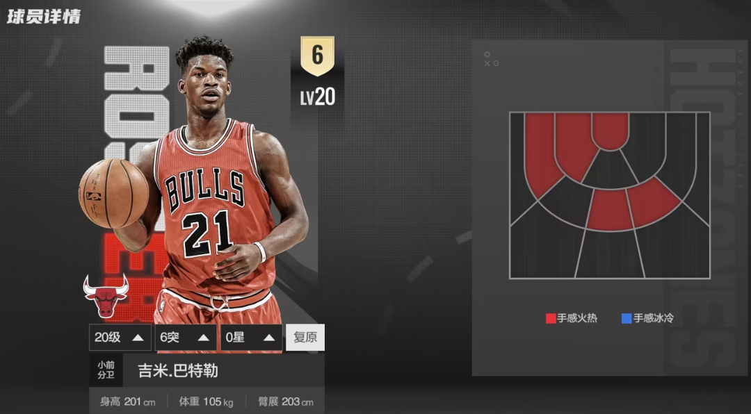 王朝模式中,担任3号位的巴特勒攻防全面,122的三分搭配接球投篮手徽章有不俗表现。157的体力,使其可以轻松打满3节。