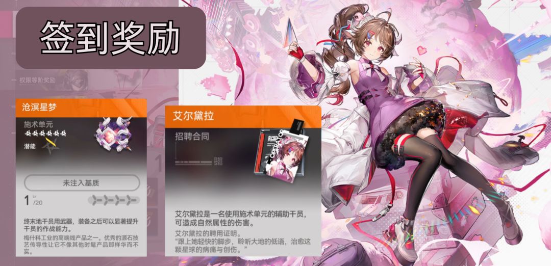 图4:奖励四、签到奖励(此为内测奖励,仅作参考)6星干员“艾尔黛拉”、6星武器“沧溟星梦”(“艾尔黛拉”专武)、特许寻访凭证×12