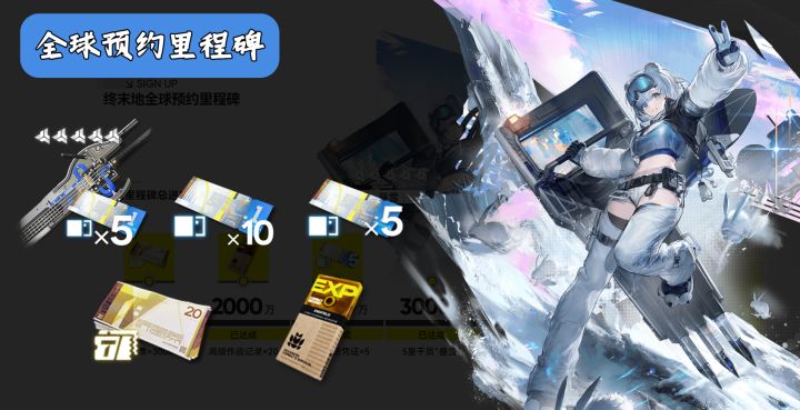 图2:奖励二、全球预约里程碑5星干员“昼雪”、5星武器“钟点之声”、基础寻访凭证×20、高级作战记录×20、折金票×30000