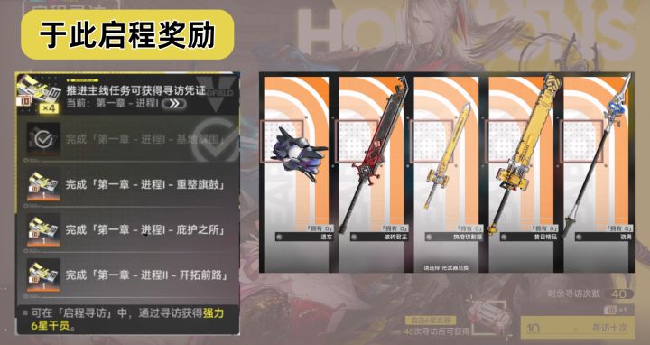 图3:奖励三、于此启程推进主线可以获得40抽寻访凭证,40抽内必出六星常驻角色,40抽后赠送自选6星武器箱。