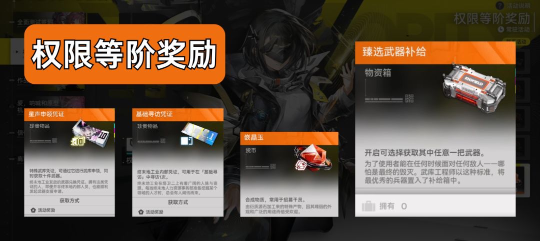 图5:奖励五、权限等阶奖励臻选武器补给(自选6星武器)×1、特殊武器凭证×10、基础寻访凭证×40、嵌金玉×4000